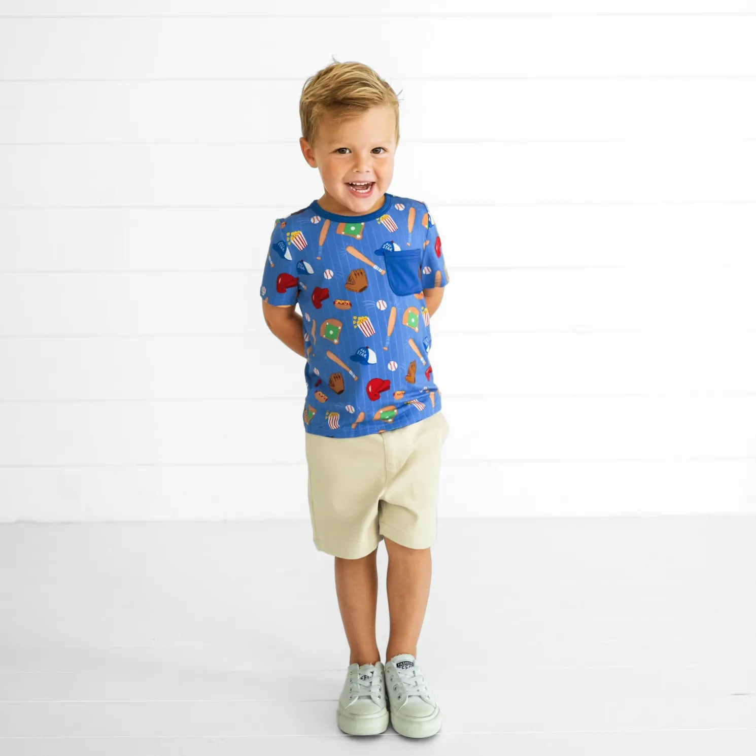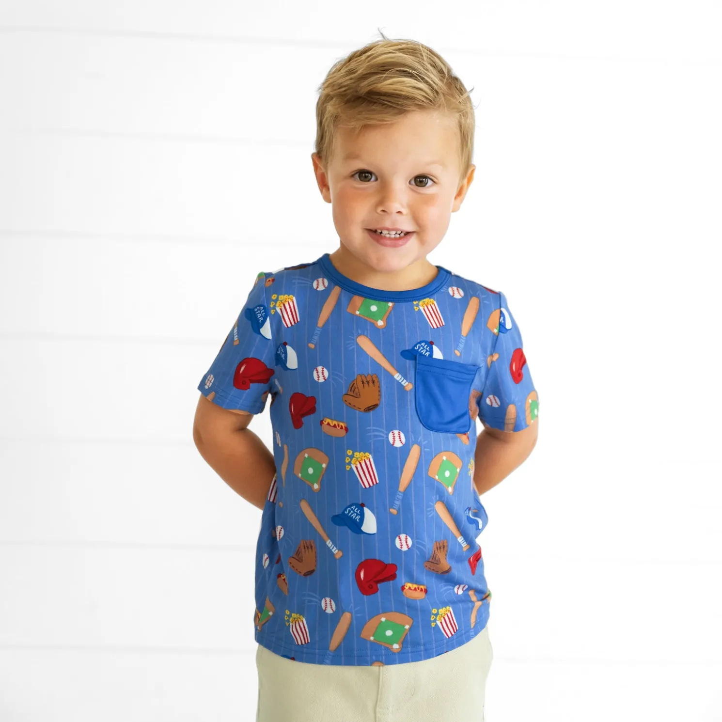 Batter up for playtime perfection! Crafted from our soft and durable Soluxe® Bamboo, this sporty pocket tee is built for all-day fun. Featuring tagless comfort and a relaxed fit, it’s gentle on sensitive skin while providing plenty of room for running, jumping, and exploring. The fun All Stars print and handy pocket make it playful and practical — ideal for mixing, matching, and layering with other Little Sleepies styles.