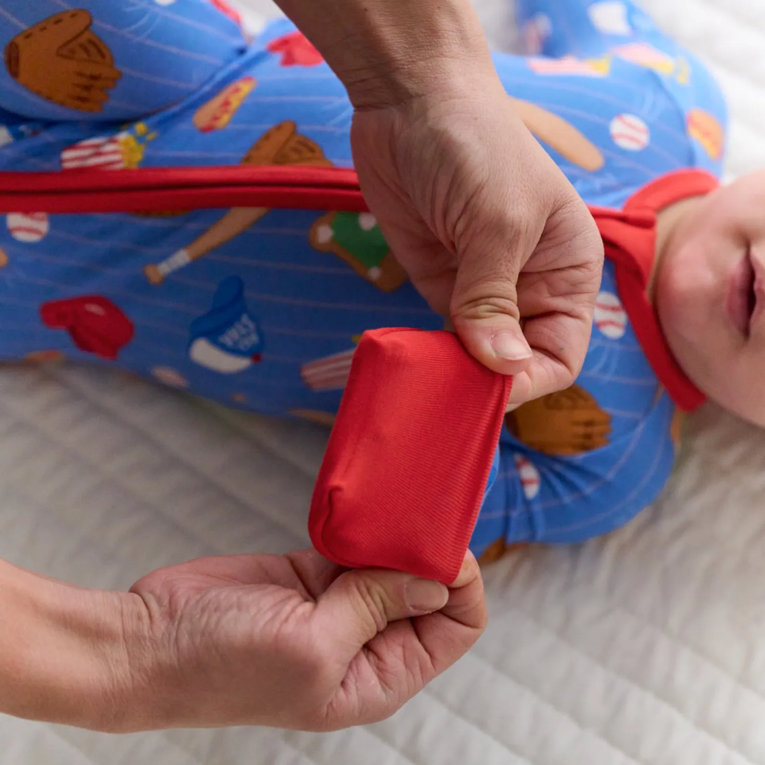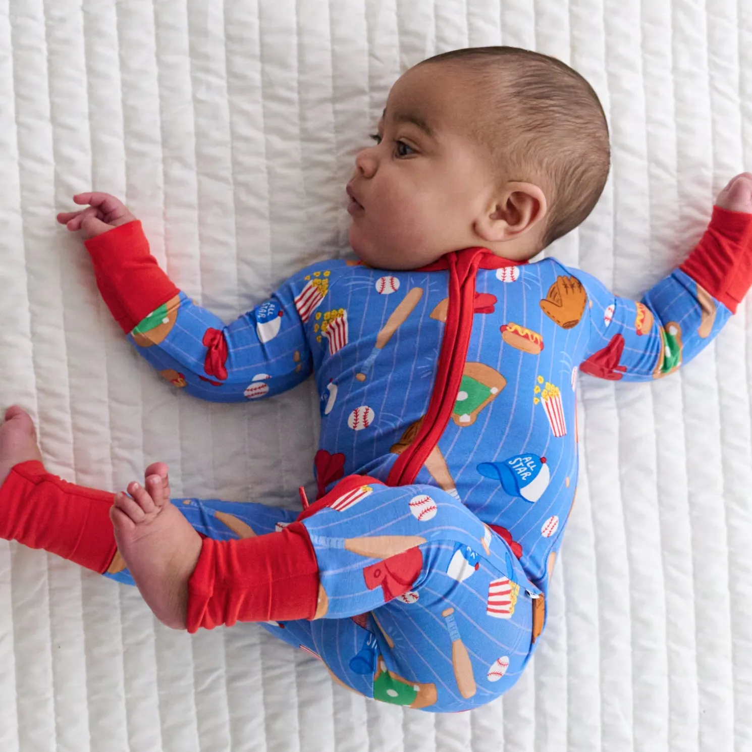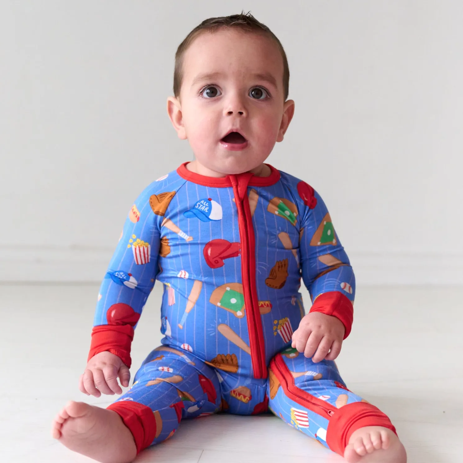 Step up to the plate with our All Stars Zippy, made for your future MVP. This sporty print features gloves, bats, baseballs, stadium snacks, and more! The classic blue background with pinstripes and bright red trim brings major league vibes. Crafted from our signature Lunaluxe® Bamboo, it includes game-winning details like fold-over feet & mittens, a 2-way zipper for quick changes, and no scratchy tags. Grab both colorways for sibling matching moments!