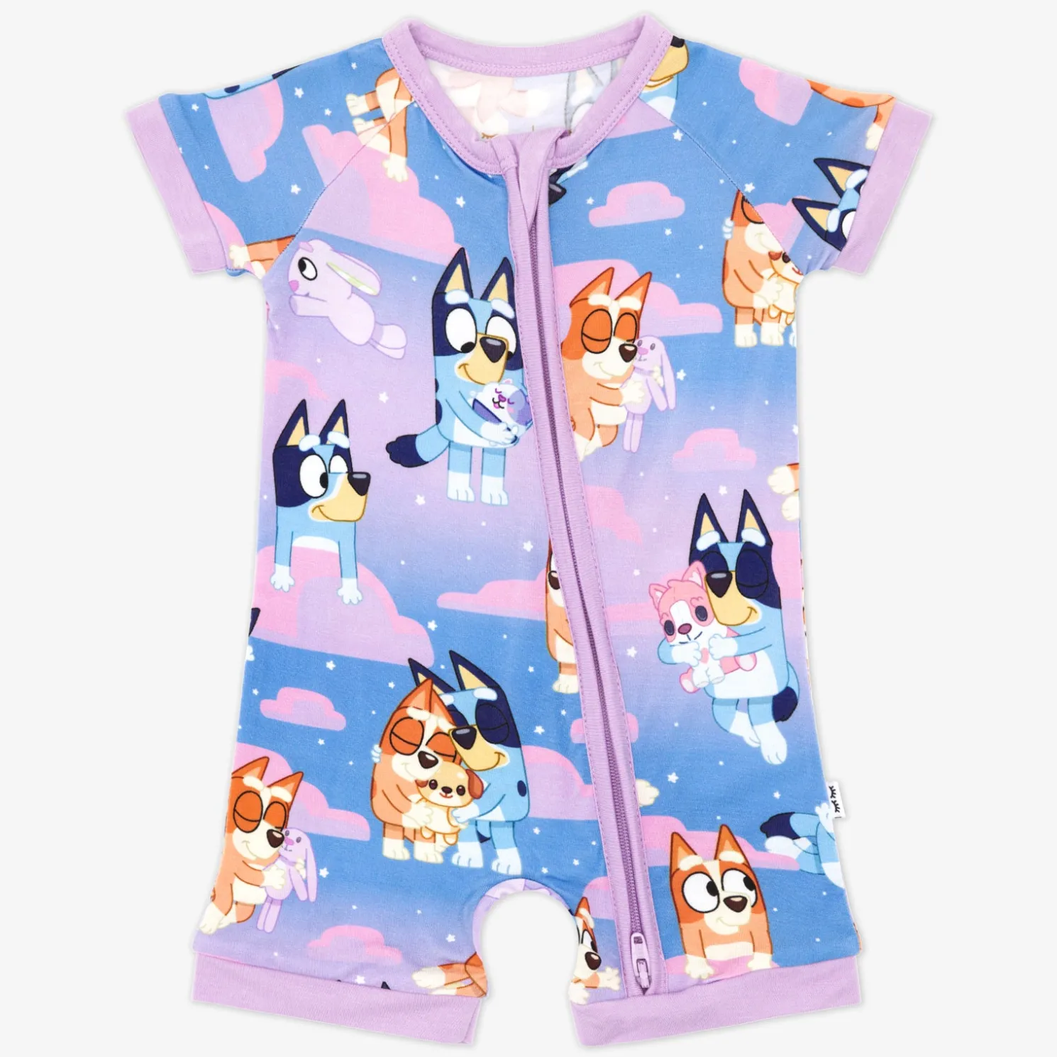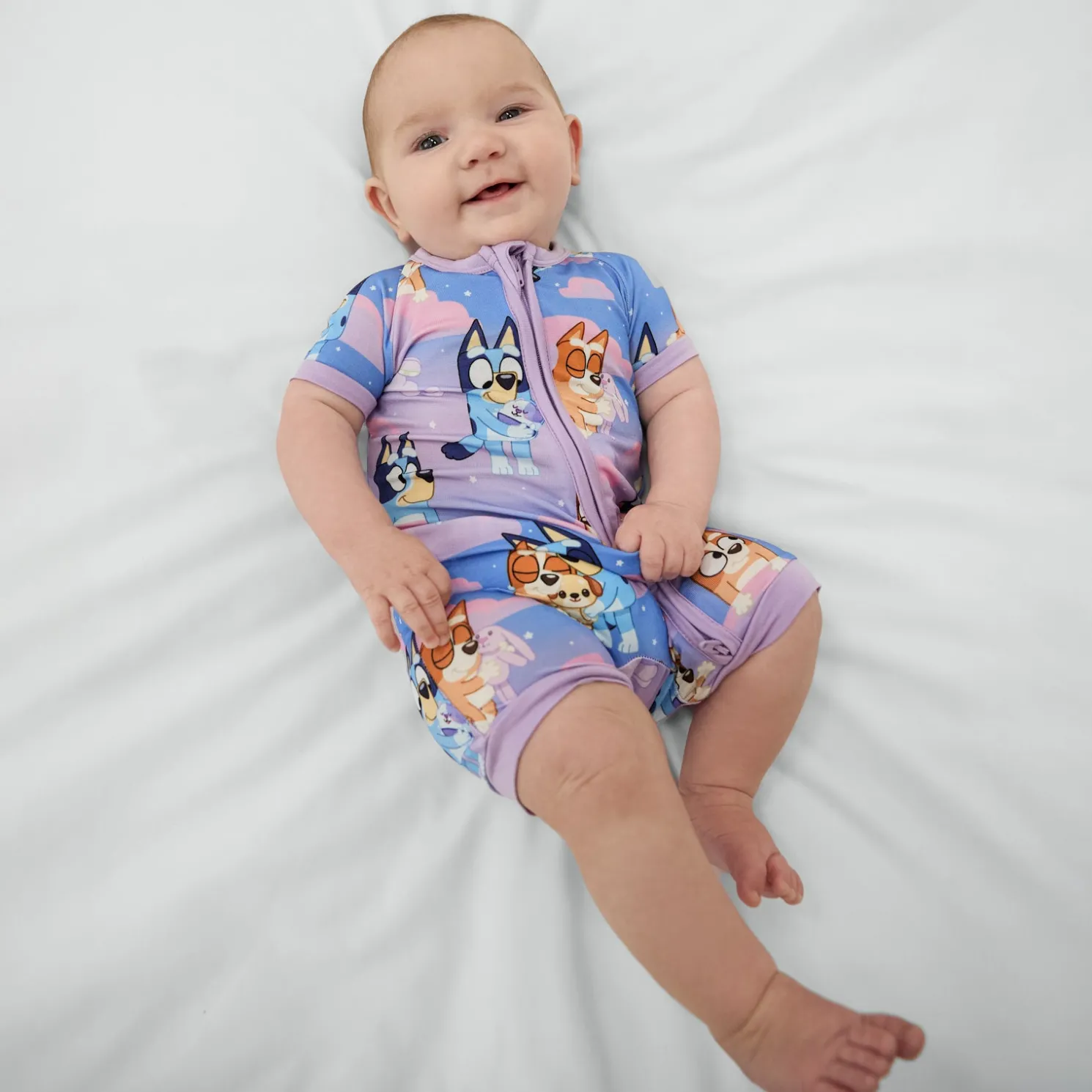 Snuggle up in the Purple Bluey Sleepytime Shorty Zippy! This ombré design is as dreamy as a twilight sky — featuring Bluey and Bingo, with fluffy clouds floating by. Made from buttery soft Lunaluxe® Bamboo, it’s gentle on sensitive skin to keep your little one cozy year round. Fold-over mittens and cuffs, a double zipper, and no scratchy tags make it perfect for sweet dreams or before-bed hide-and-seek!