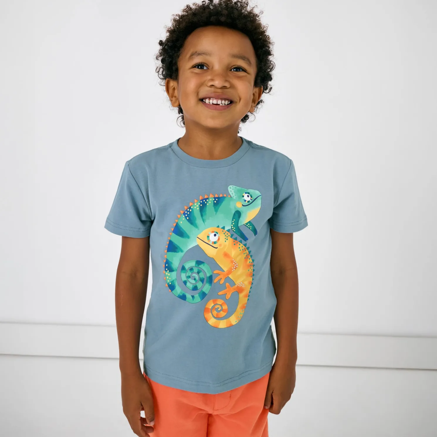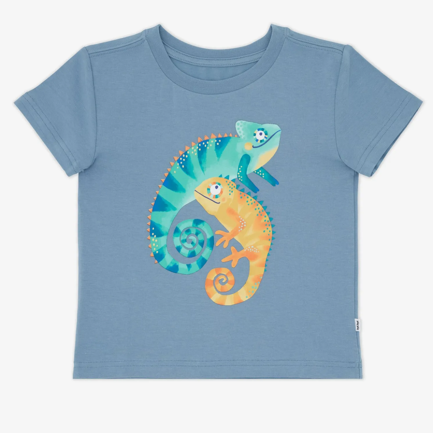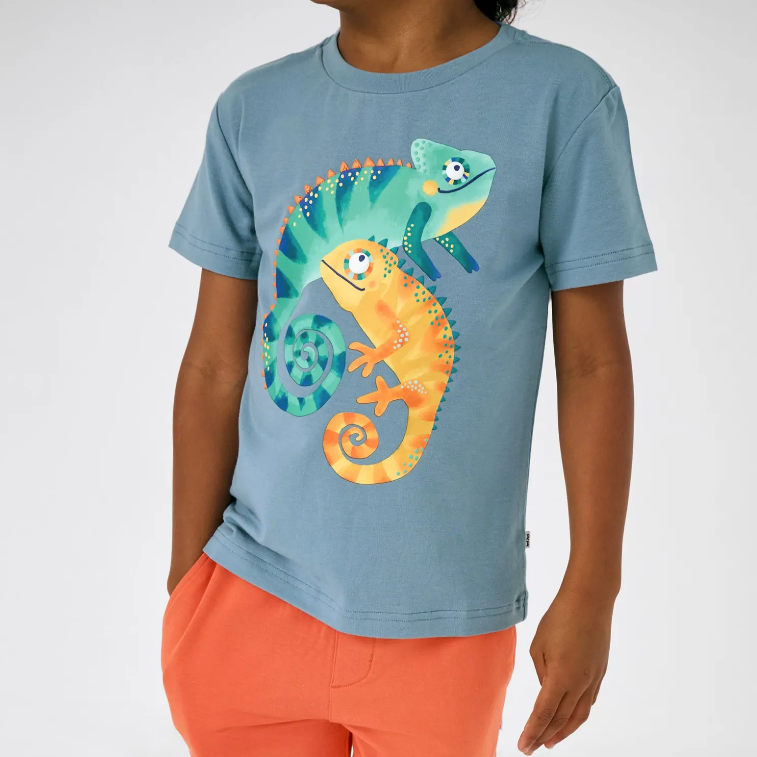 Print Description: The Chameleon Relaxed Tee is slate blue with a graphic of two chameleons on the front — one blue and one orange.