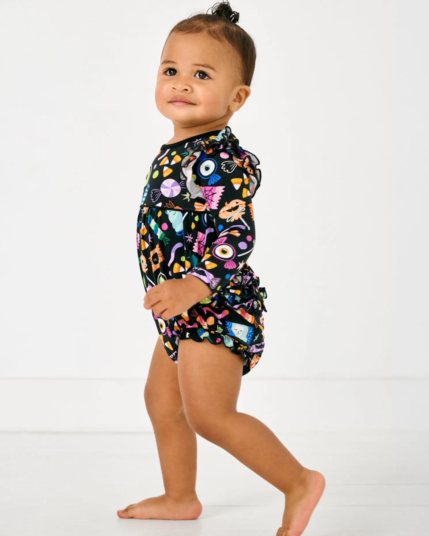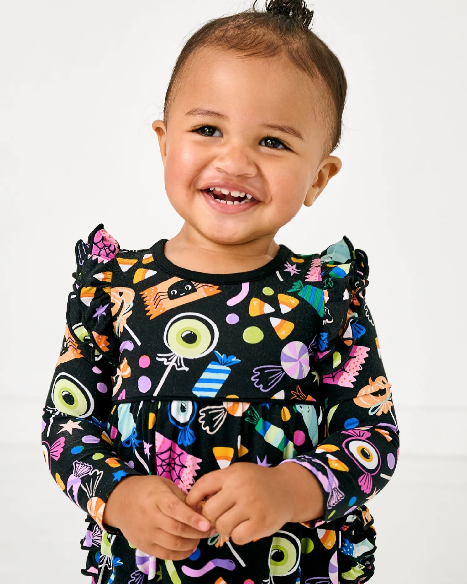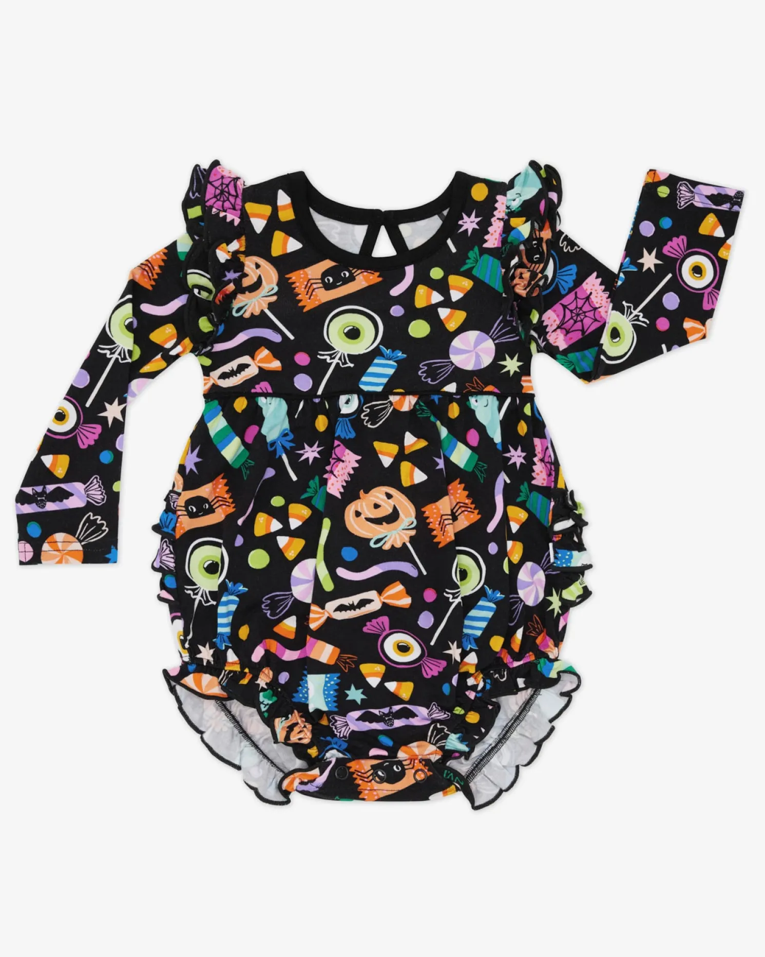 Sweet as candy! This baby romper with ruffle details features colorful Halloween treats for candy-coated cuteness. Made from soft Soluxe® Bamboo, the Halloween Haul Bubble Romper has flutter sleeve details and a snappable bottom for easy changes. Perfect for fun family matching!