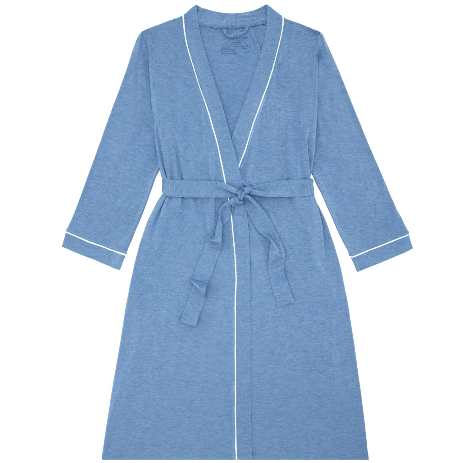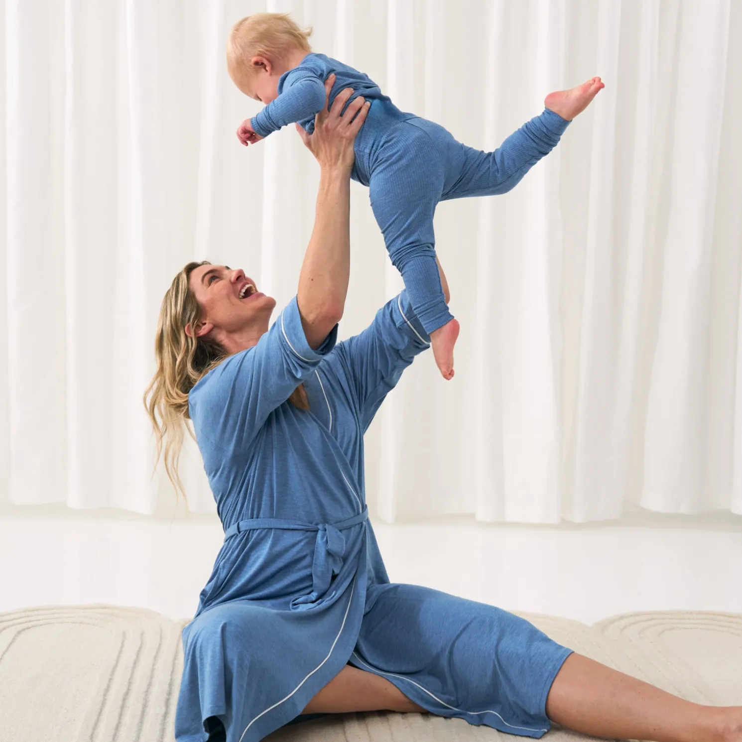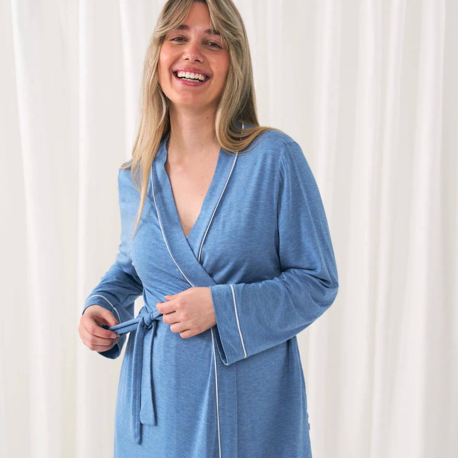 Our women’s robes are designed for each stage of mama-hood — but also, just everyday coziness! Made from buttery soft Lunaluxe® Bamboo, this comfy Heather Blue Robe has deep pockets for all your essentials, an adjustable belt, and contrast piping for a cute and classic look.
