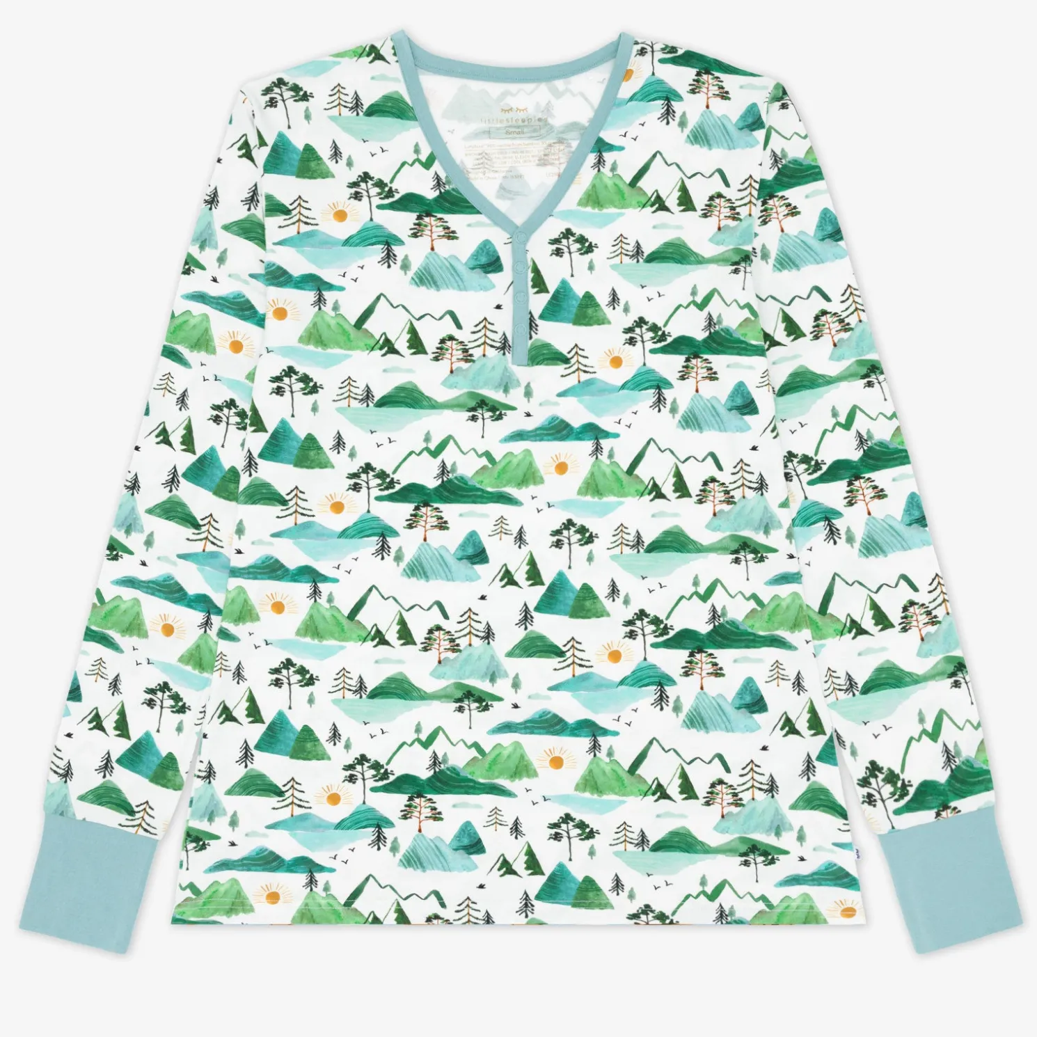 Peak perfection! Dream of the great outdoors in this Women’s PJ Top, featuring a mountain and tree print with a gorgeous watercolor spin. Made from buttery soft and seasonless Lunaluxe® Bamboo, it’s perfect for year-round wear. With a relaxed V-neck and easy-access snaps for nursing, this top is all about cozy comfort. Pair with the matching pants, then snag styles for the kiddos, too!