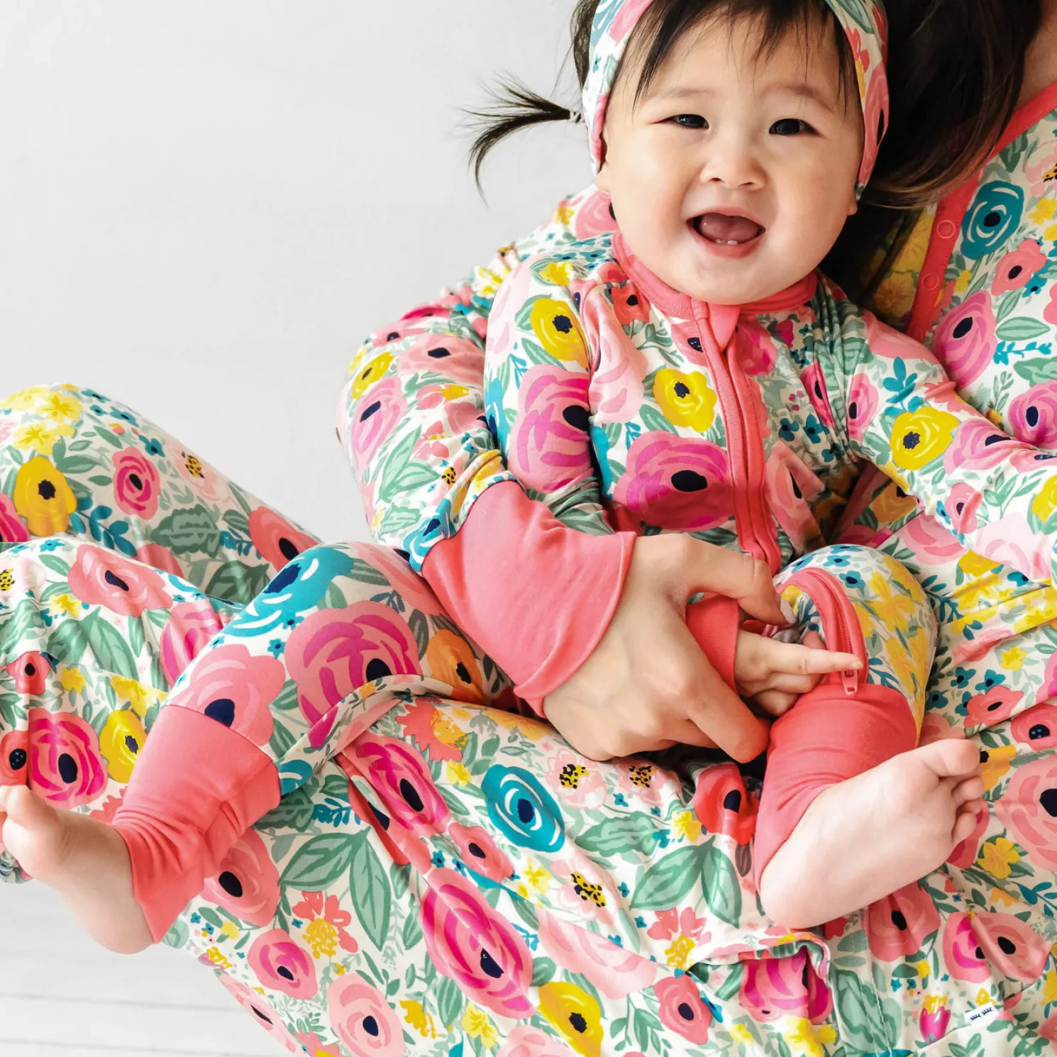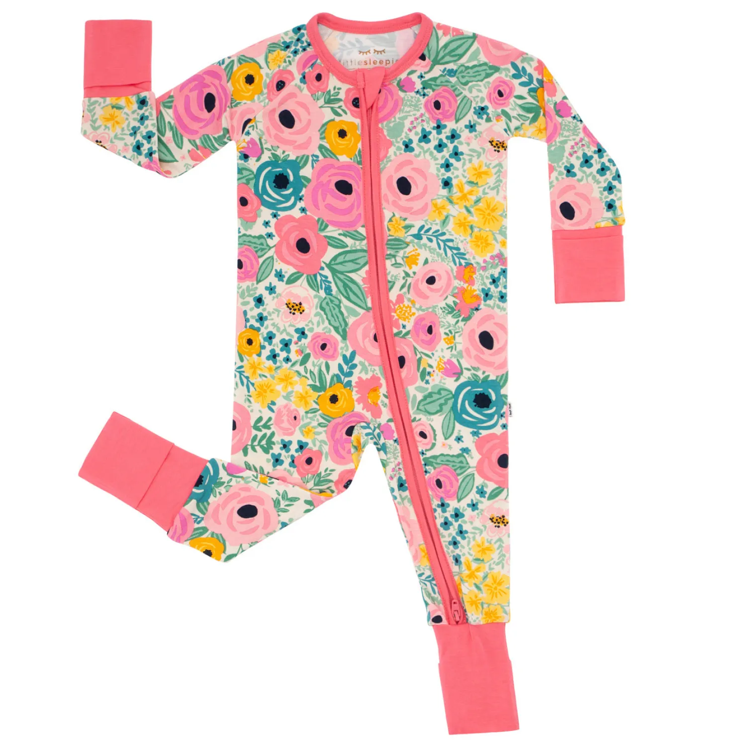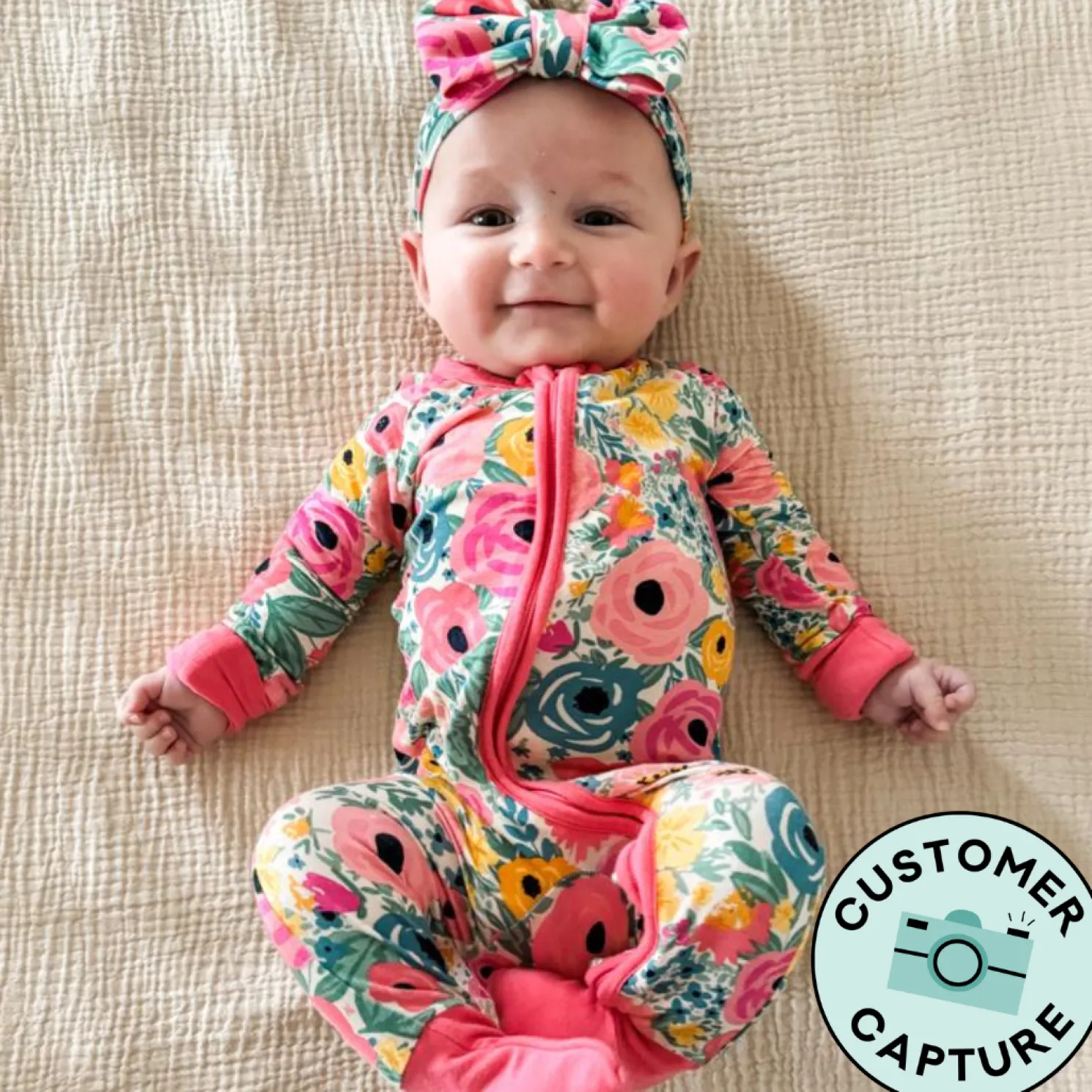 Sweet dreams await in this pretty floral Zippy! Featuring watercolor blooms in vibrant shades of pink, yellow and blue on a cream background. Made from our signature Lunaluxe® Bamboo, with thoughtful features like fold-over feet & mittens, a 2-way zipper, and no scratchy tags. Don’t forget a matching Luxe Bow for the cutest photos!