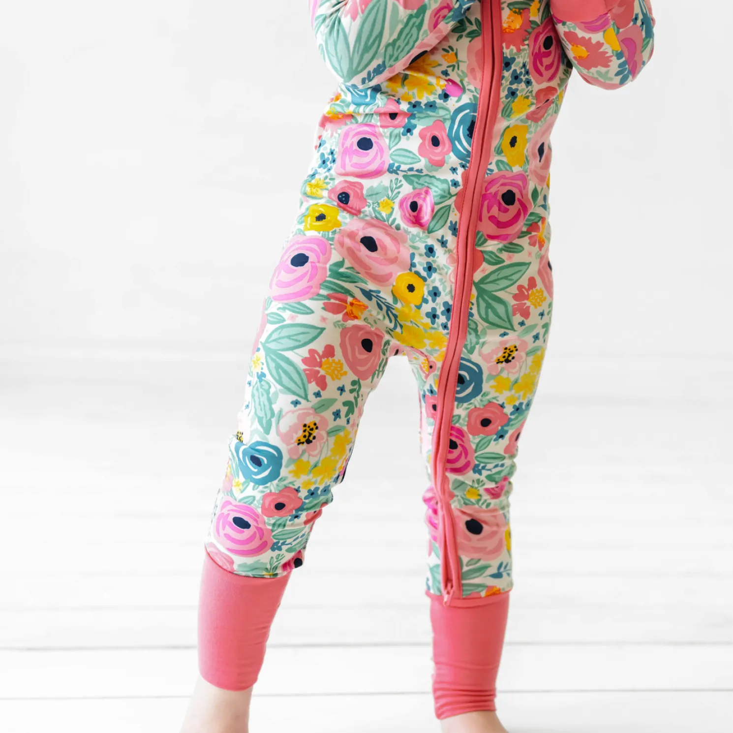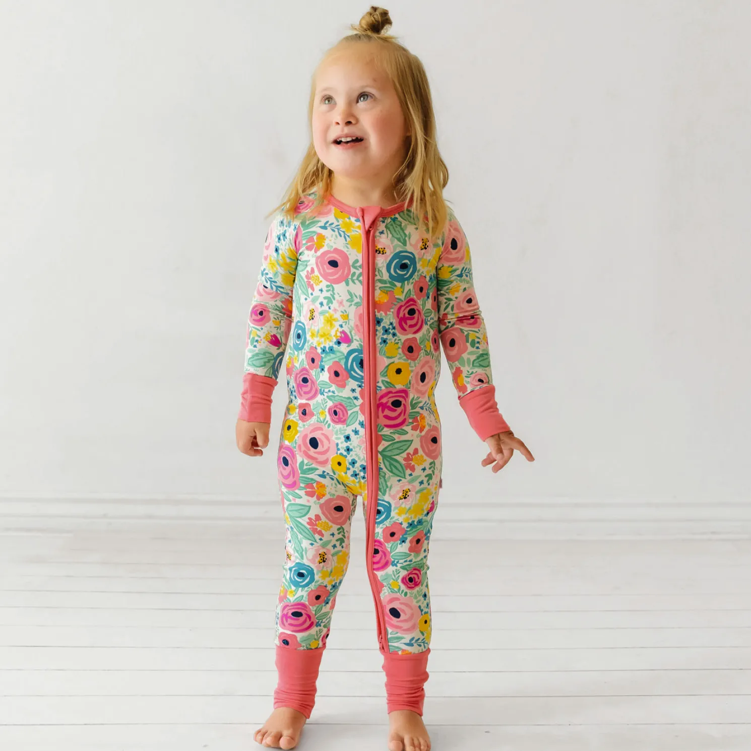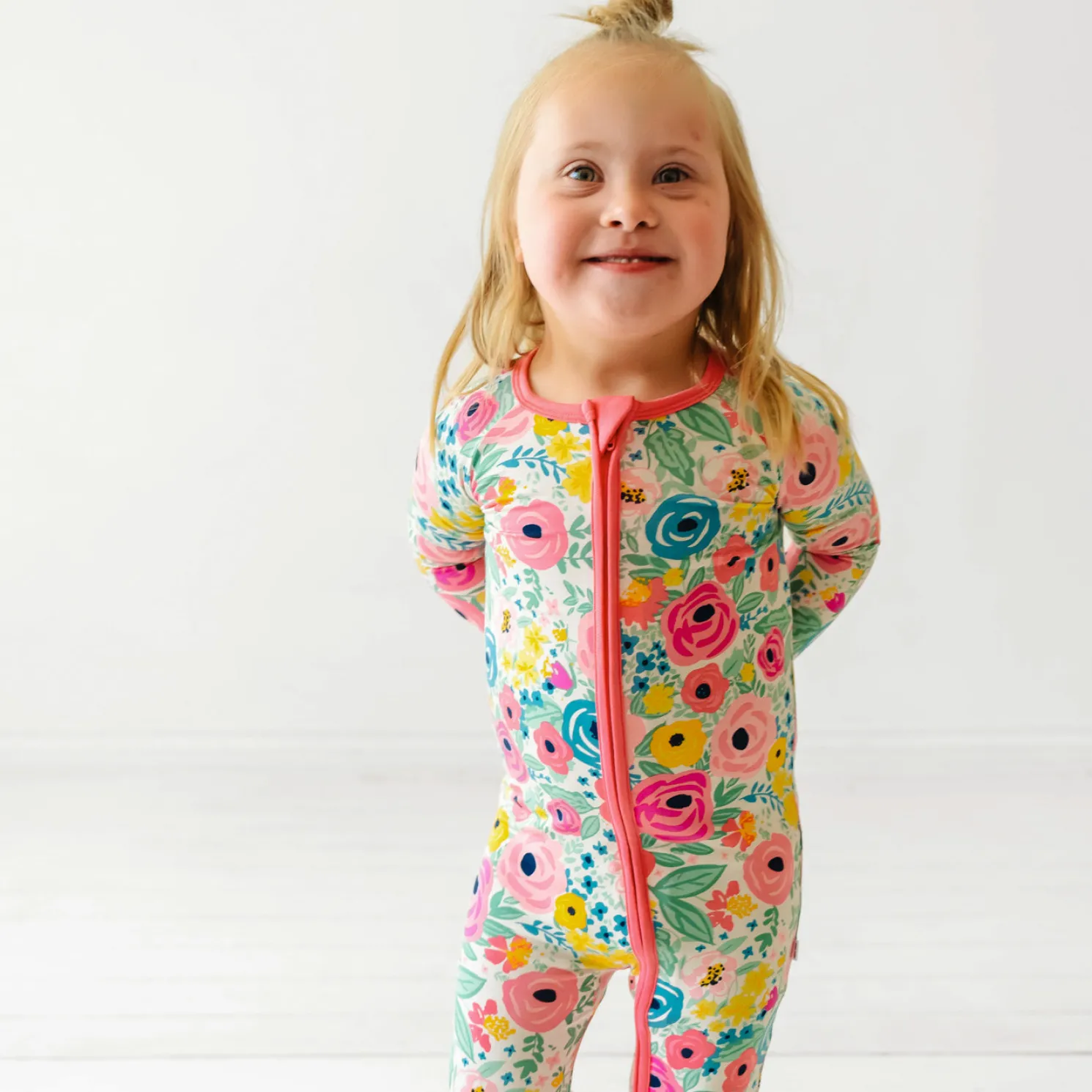 Sweet dreams await in this pretty floral Zippy! Featuring watercolor blooms in vibrant shades of pink, yellow and blue on a cream background. Made from our signature Lunaluxe® Bamboo, with thoughtful features like fold-over feet & mittens, a 2-way zipper, and no scratchy tags. Don’t forget a matching Luxe Bow for the cutest photos!