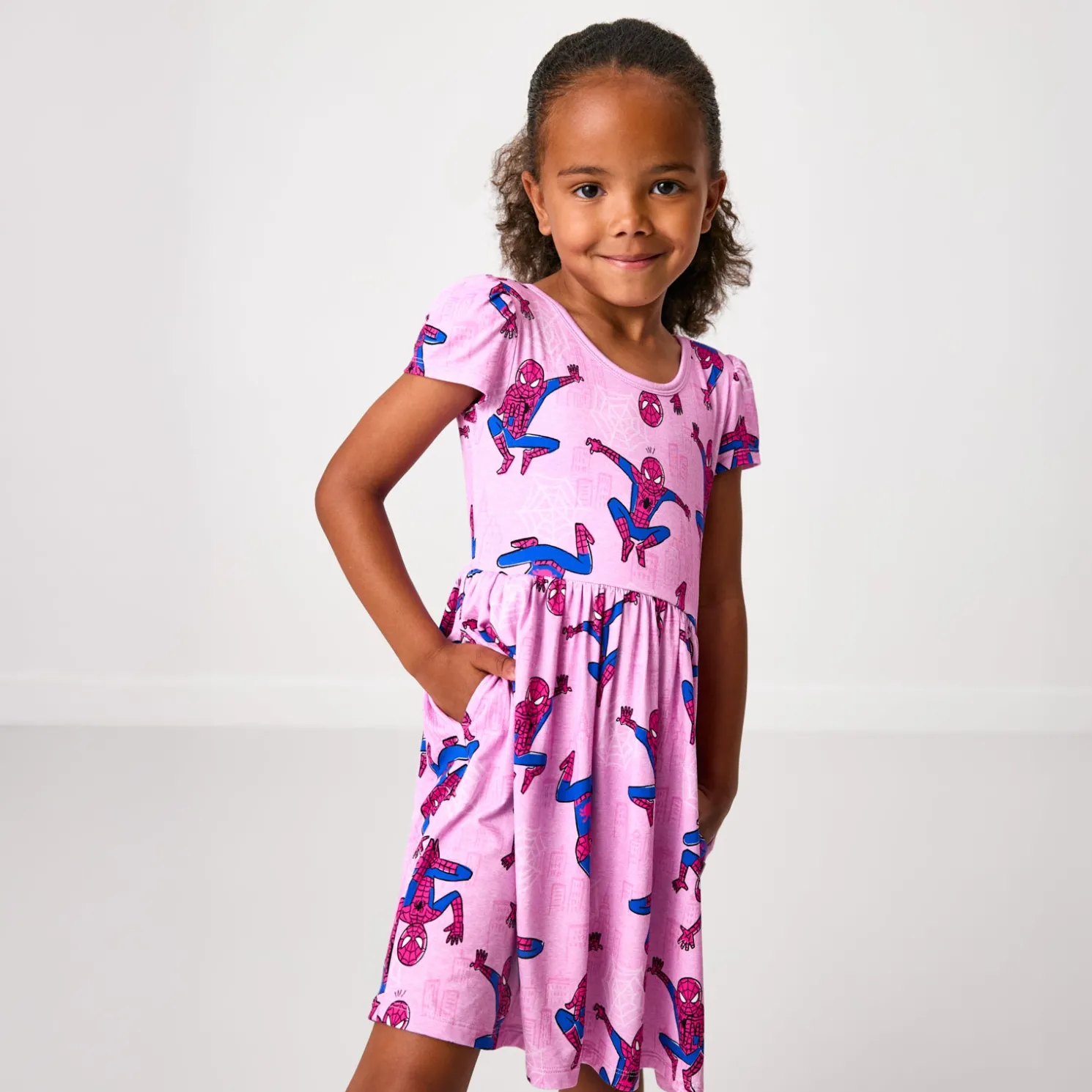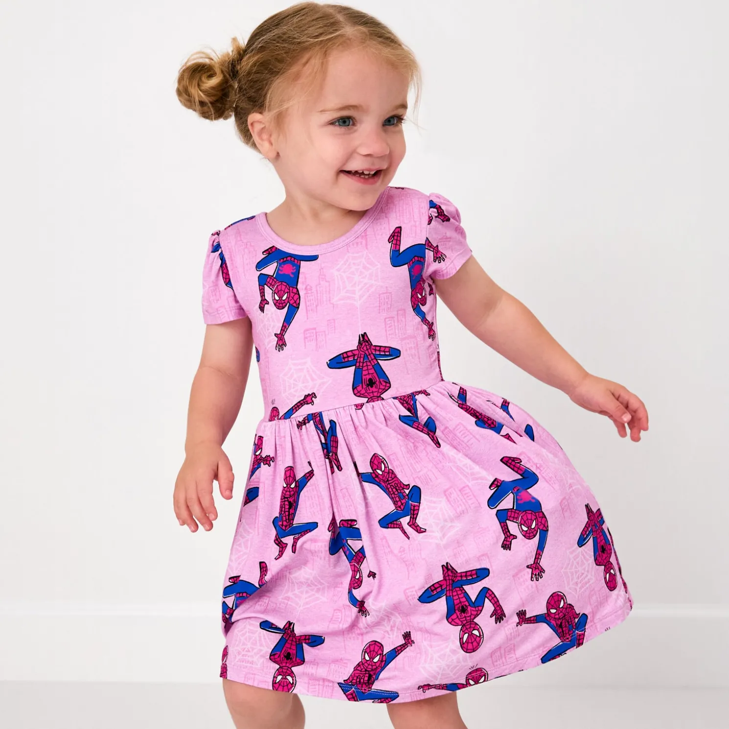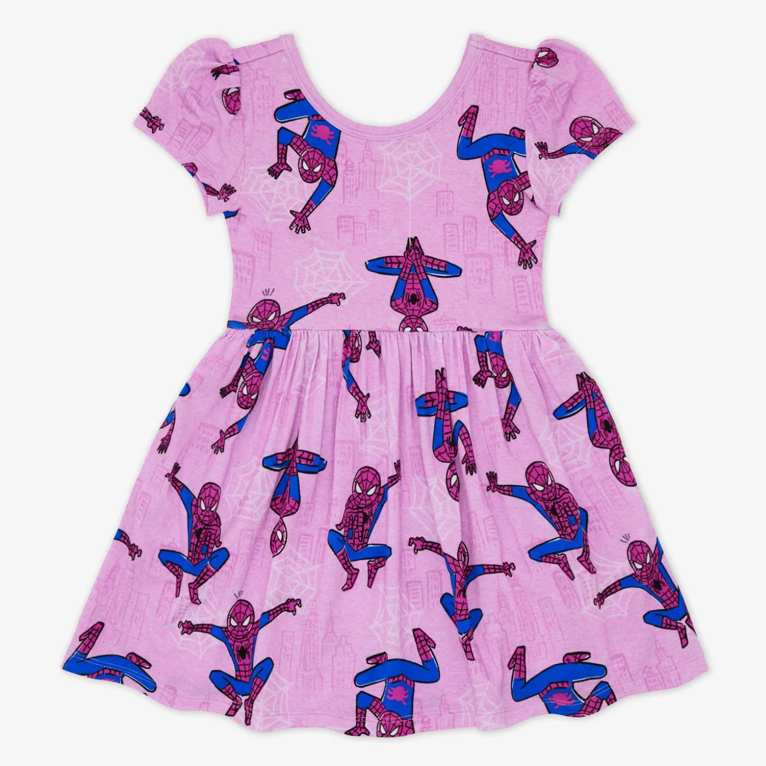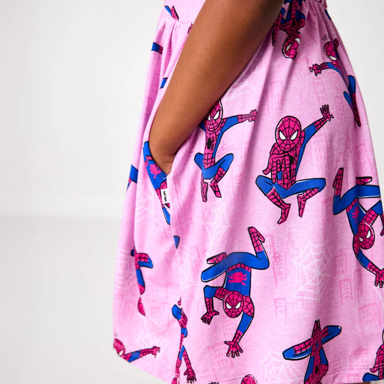 Print Description: The Spidey Sense Skater Dress features Marvel’s Spider-Man swinging, jumping, and crawling across buildings and spiderwebs. The background is heather pink.