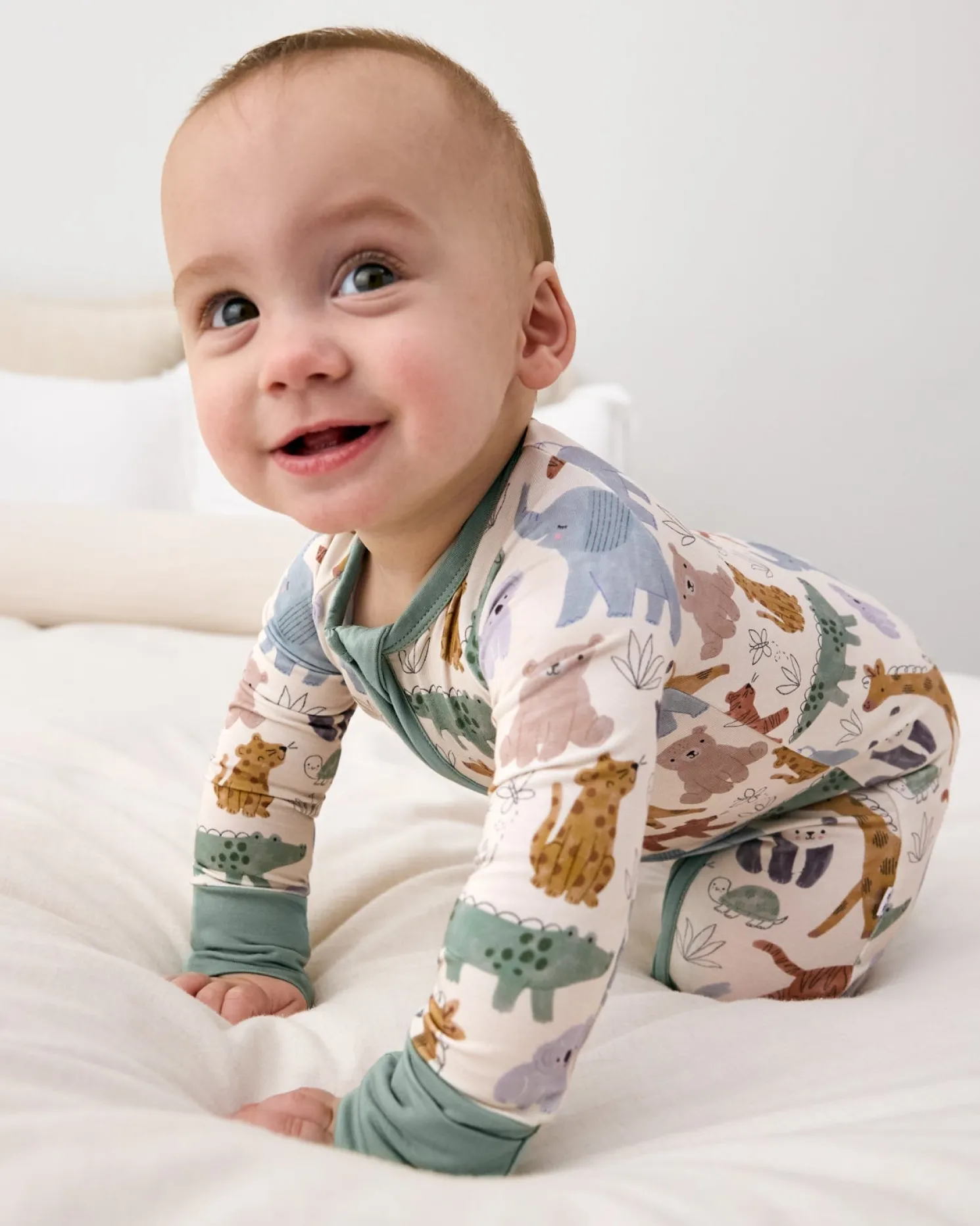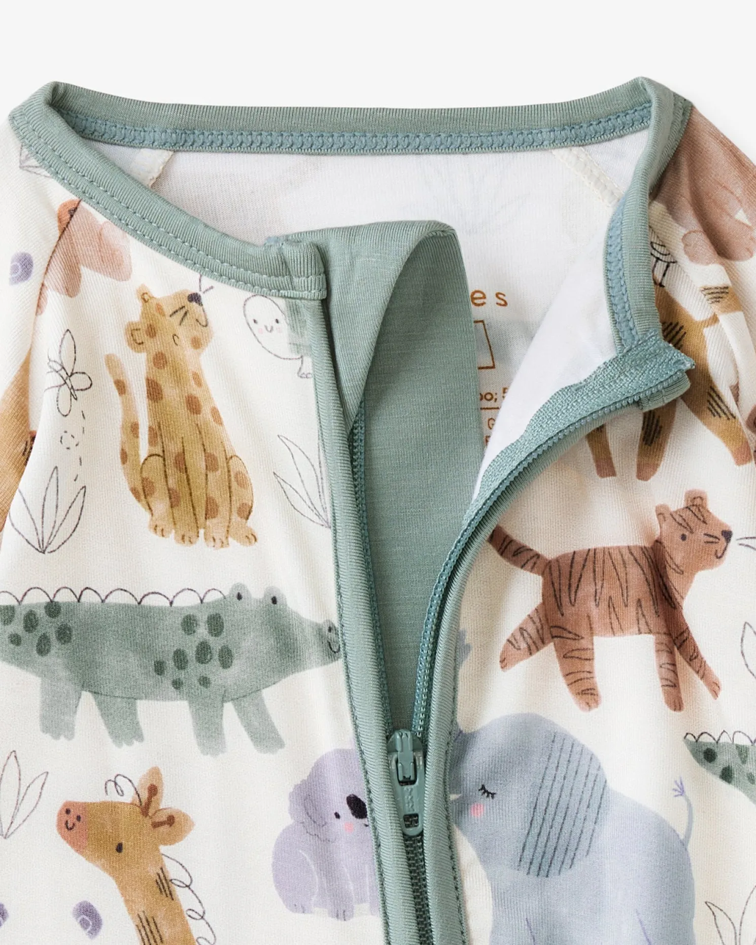 Print Description: Sweet Safari features watercolor paintings of elephants, giraffes, panda bears, and more on an off-white background. The trim is sage green.