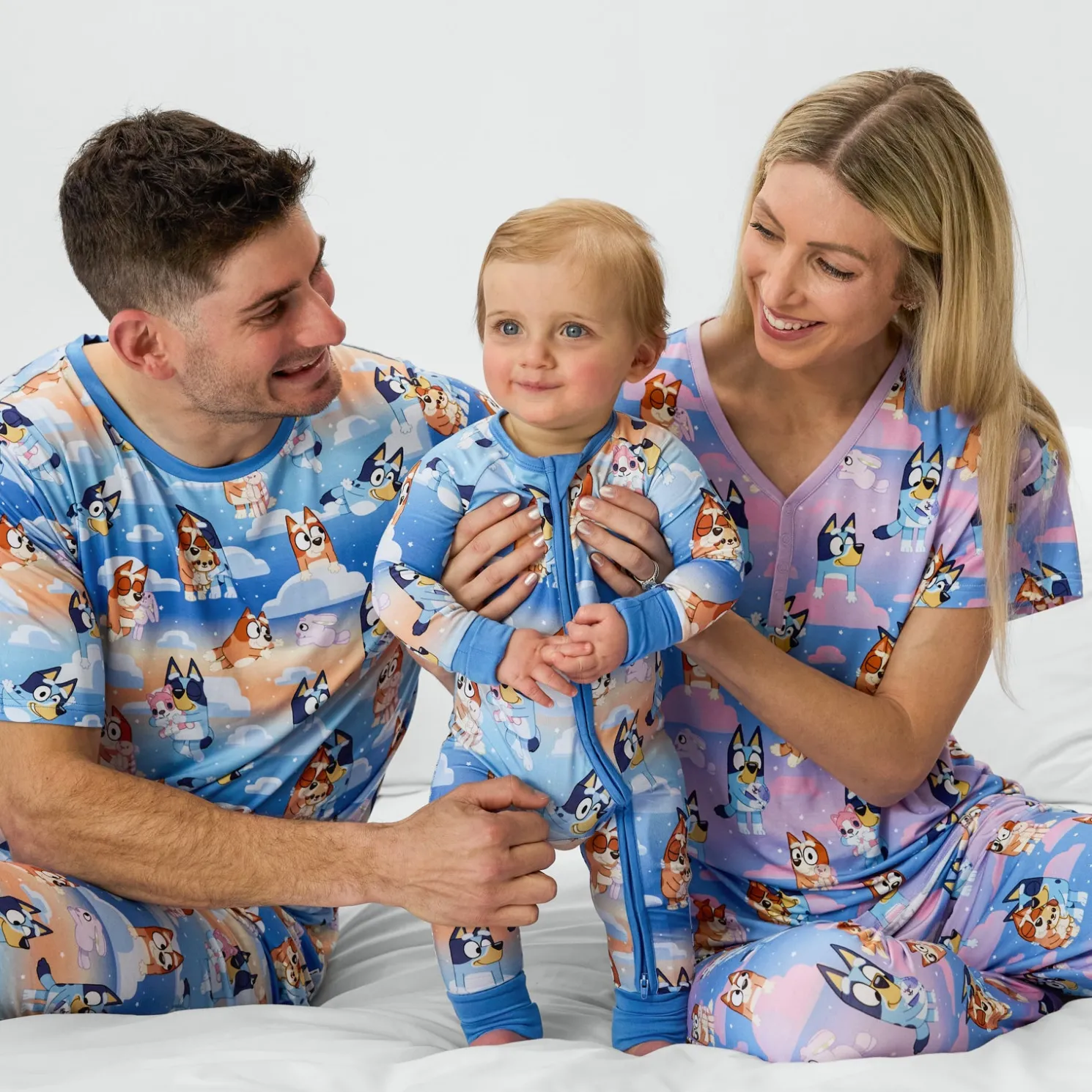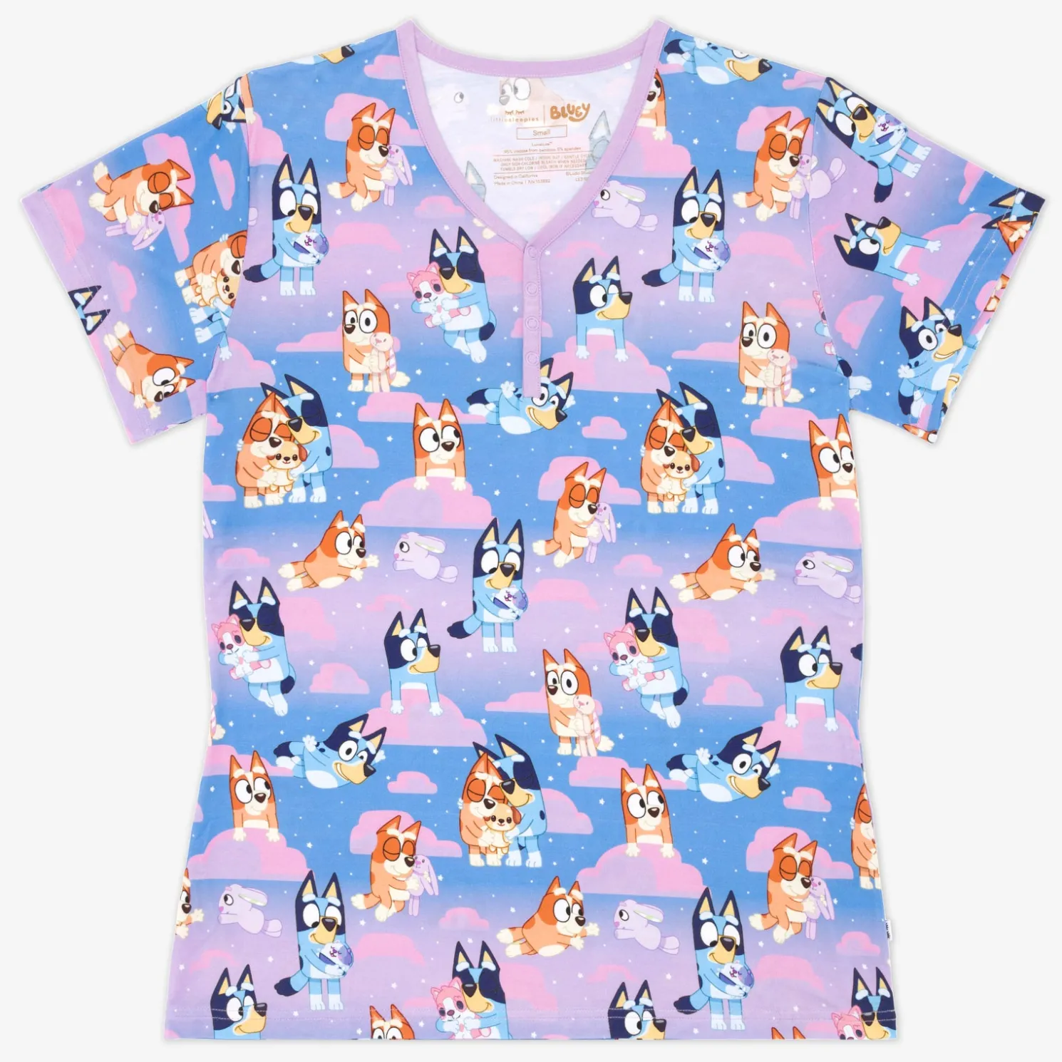 Dream big in the Purple Bluey Sleepytime Women’s Pajama Top! Featuring ombré twilight skies with Bluey and Bingo floating by, this V-neck sleep henley is made from buttery soft Lunaluxe® Bamboo. It’s tagless, ideal for nursing, and made for sleepytime adventures when paired with the matching bottoms.