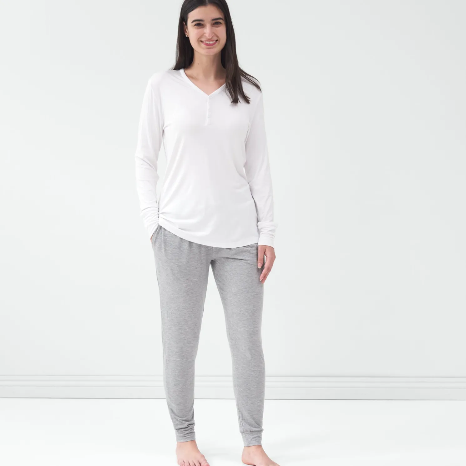 The comfiest classic White PJ Top! Crafted from our buttery soft and stretchy Lunaluxe® Bamboo, with a relaxed v-neck that makes it as comfy as it is cute. It also features snaps at the neckline for easy nursing access. Pair it with Little Sleepies PJ pants, or swap in your favorite jeans!