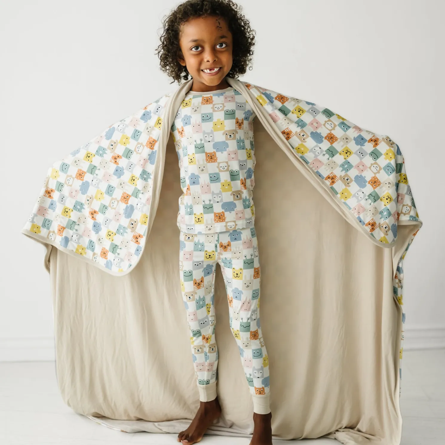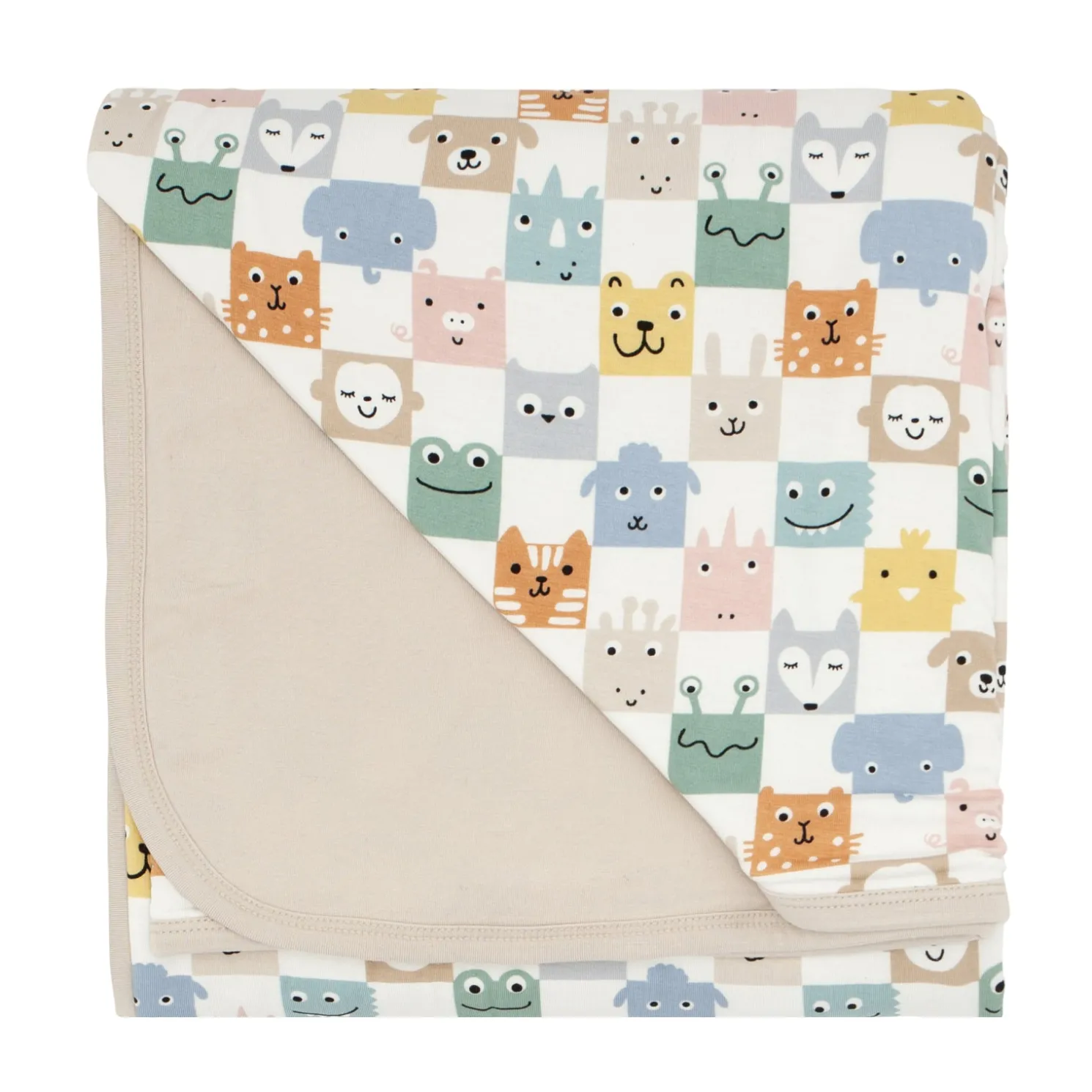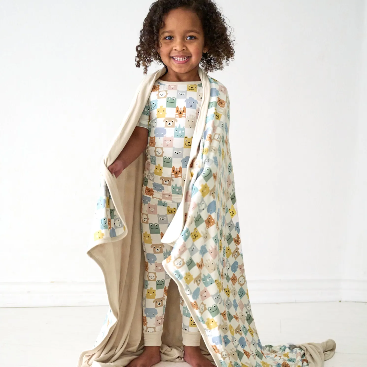 Snuggle up for storytime under this cute checkerboard Cloud Blanket®! Featuring adorable animals in trendy muted shades, with a solid shade of taupe on the other side. Made from three luxurious layers of our signature Lunaluxe® Bamboo, it’s as buttery soft as your matching jams!