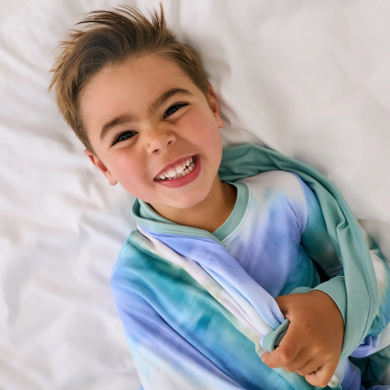 Cozy cosmic vibes are here! This bamboo blanket features soothing watercolor waves in a blue ombré design. Made from triple layered Lunaluxe® Bamboo, its breathable fabric is gentle on sensitive skin and perfect for summer snuggles with the fam. Grab matching PJs for even more family fun!