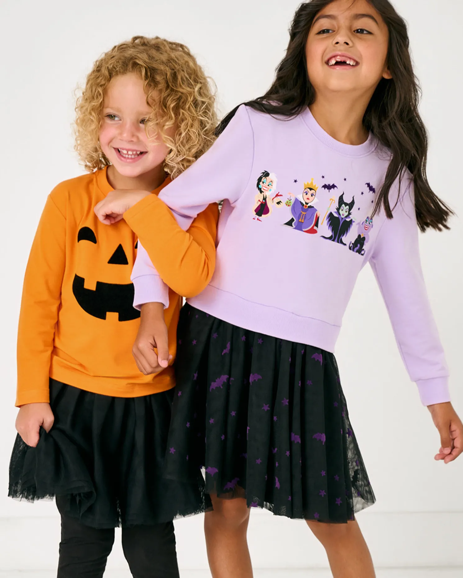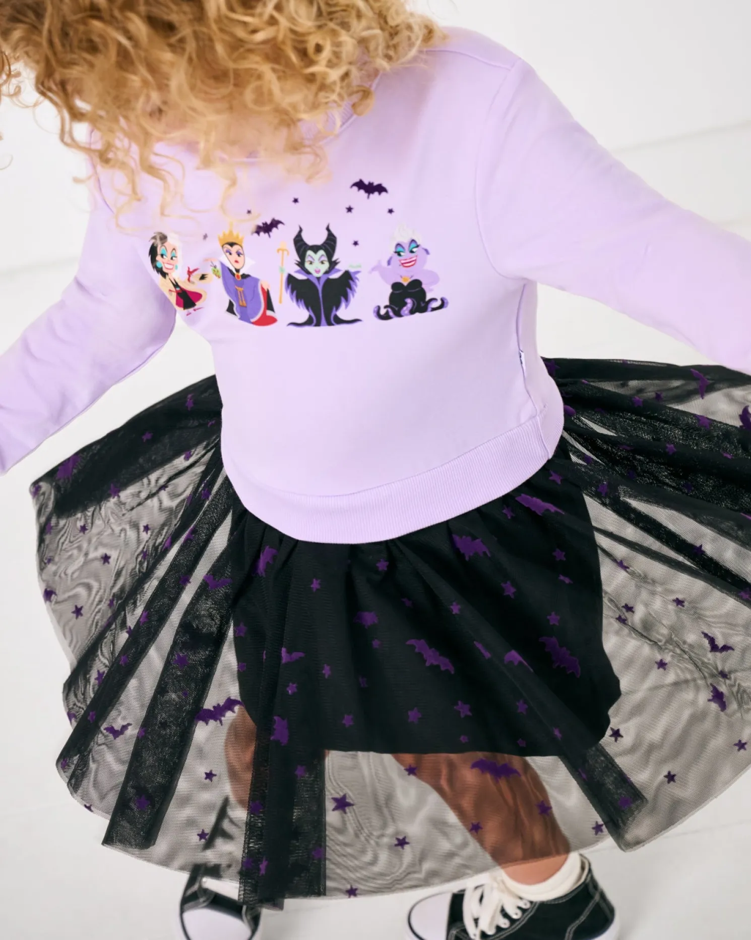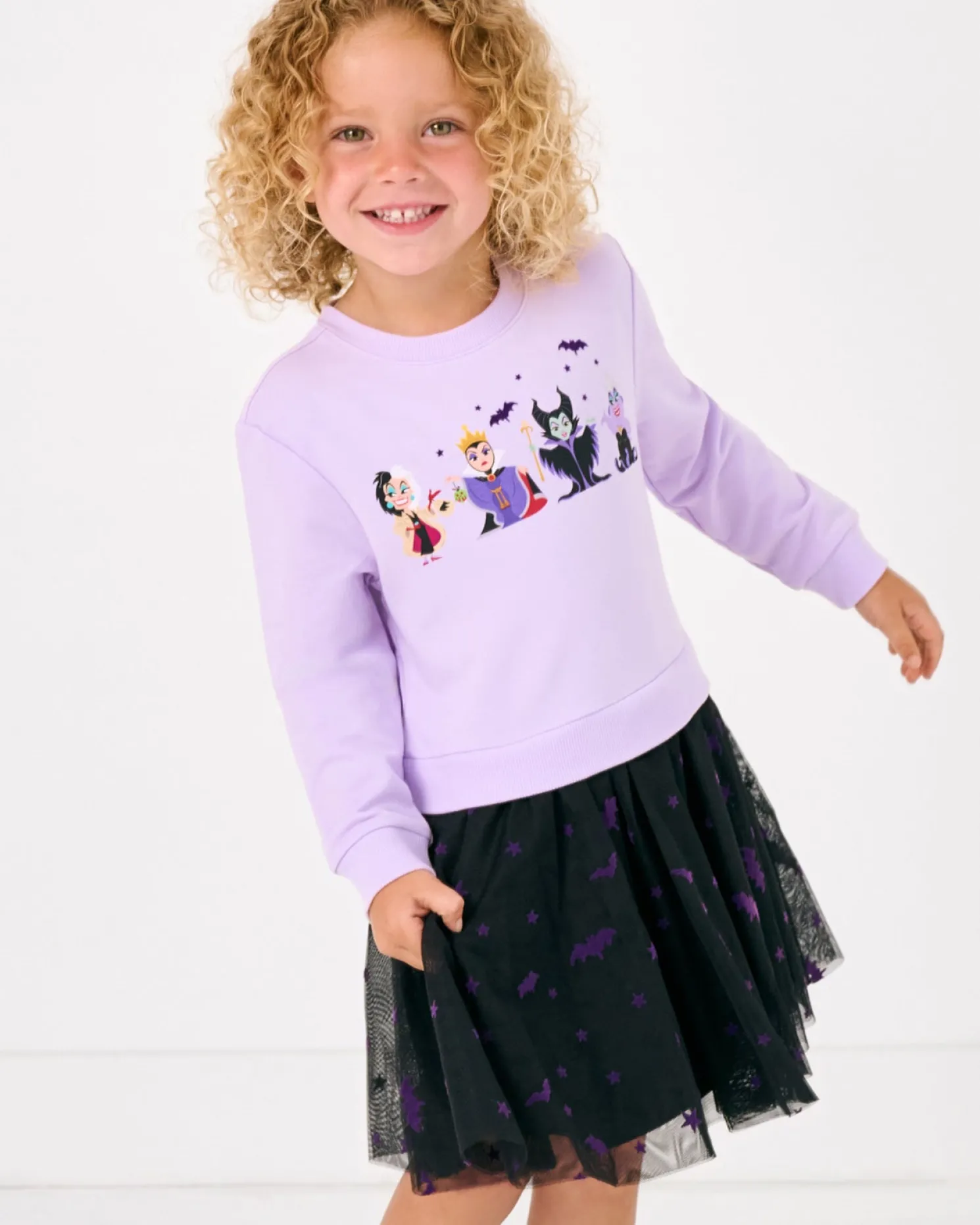 Print Description: The Disney Villains Crewneck Tutu Dress is pastel purple with a black tulle skirt. Across the chest are Disney’s Cruella de Vil, Evil Queen, Maleficent, and Ursula. The tulle skirt is accented with purple bats and stars.