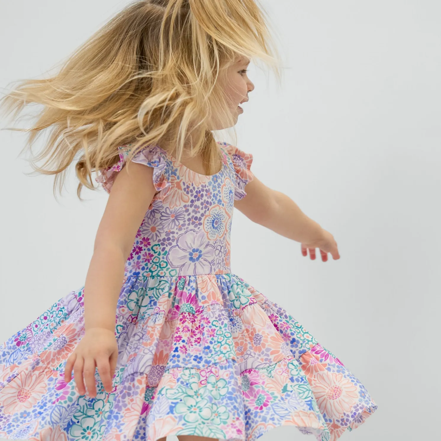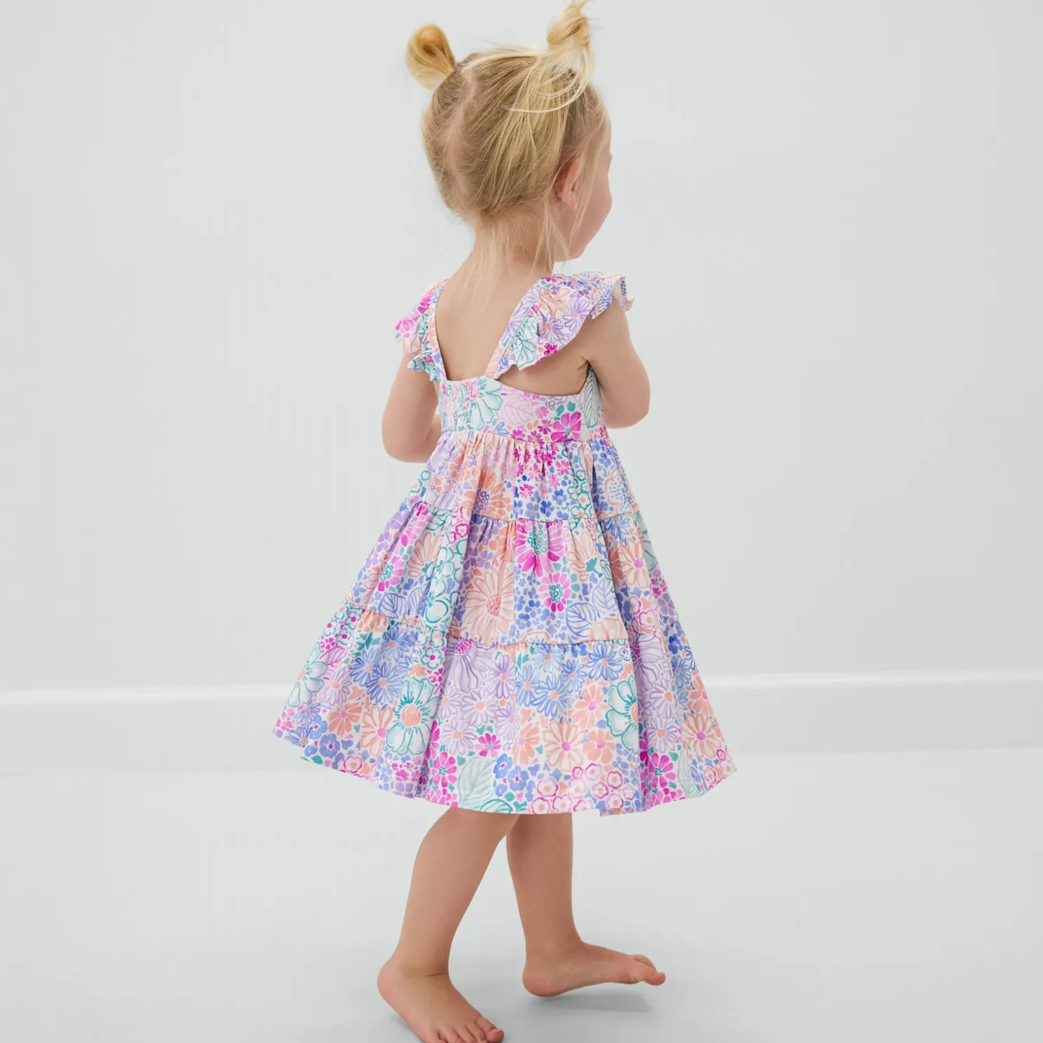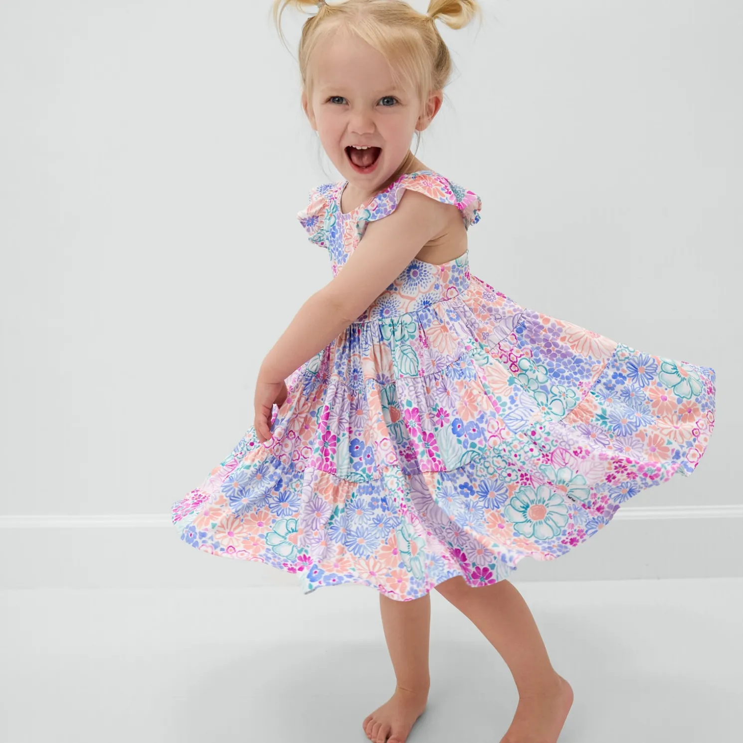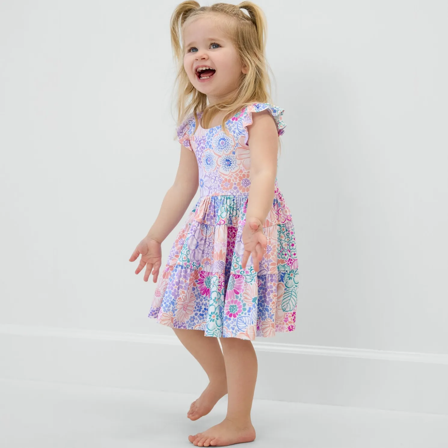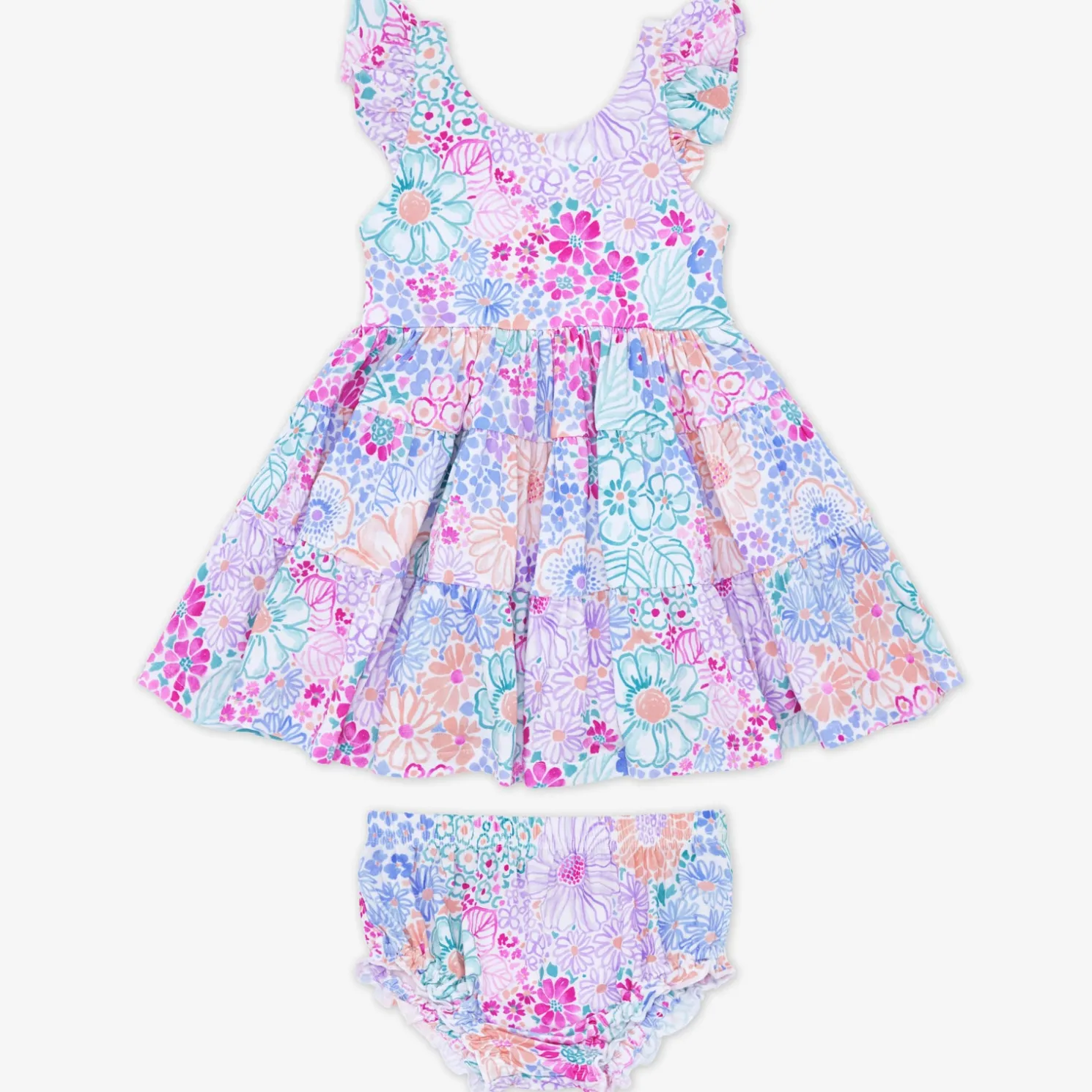 Twirl through flower fields in the Doodle Blooms Tiered Flutter Dress! Featuring whimsical hand-drawn flowers, it has a flowy three-tiered skirt and fluttery sleeves for extra cuteness. Made from durable Soluxe® Bamboo, the tagless design is petal-soft and gentle on sensitive skin, while the bloomers do diaper coverage with style. Whether for playtime or a special occasion, this darling dress is a fresh-picked favorite!