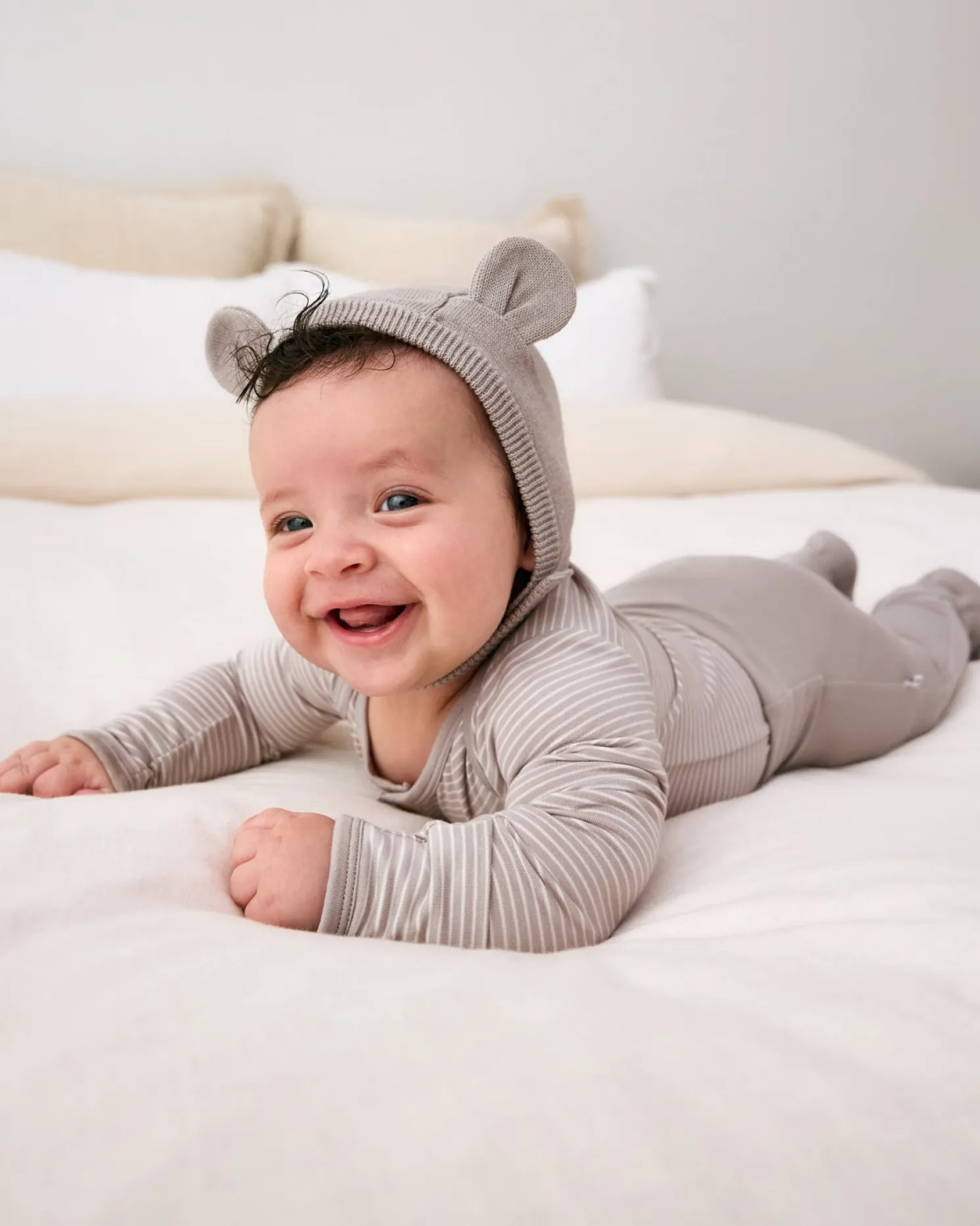 Print Description: The Dove Gray Bear Bonnet is warm gray and features 3D ears.