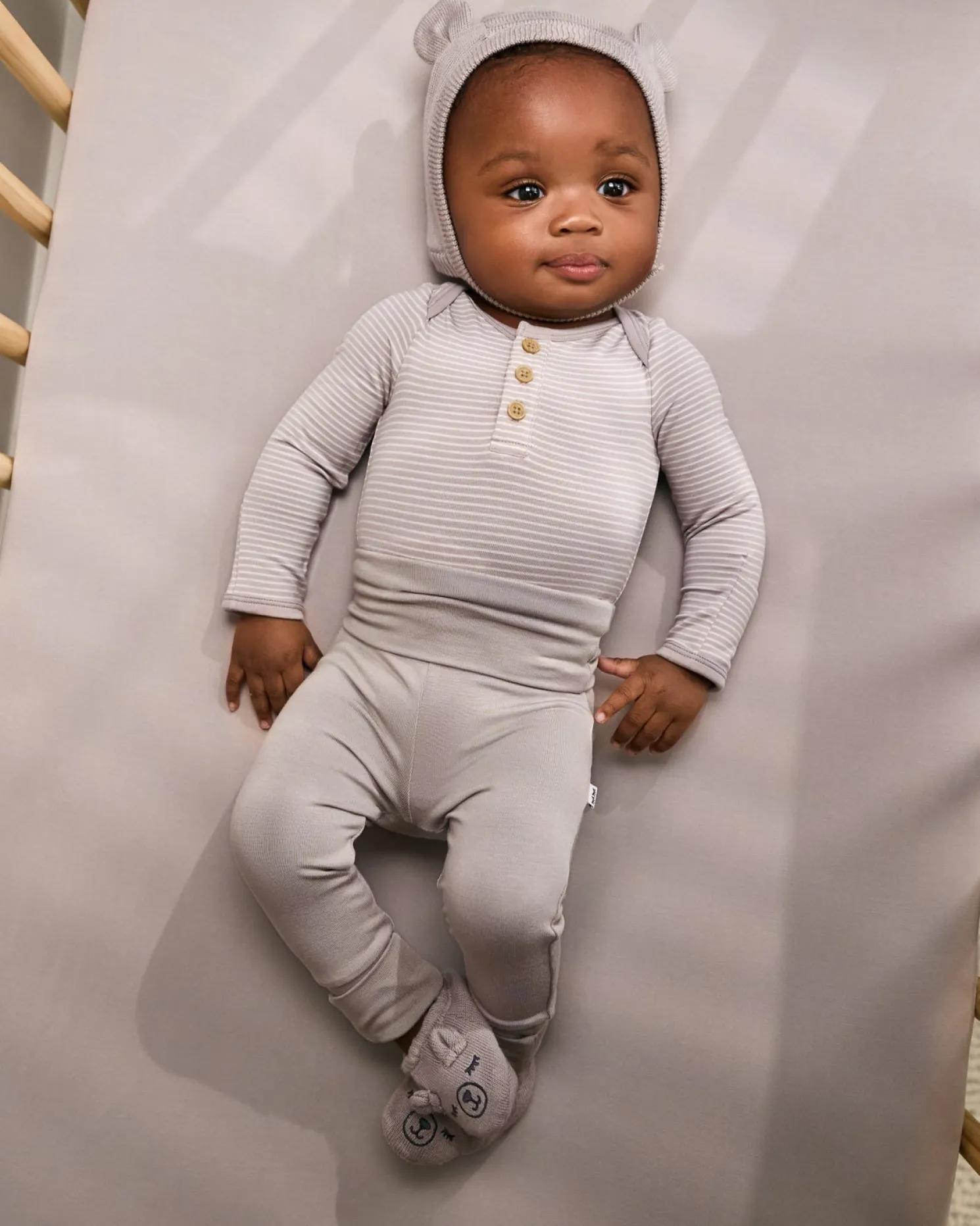 The perfect finishing touch for your little cub’s first few months. Made from super soft Soluxe® Bamboo, the Dove Gray Bear Bonnet is gentle on delicate newborn skin. Baby-safe velcro on the strap allows for an adjustable fit as your little one grows. The 3D ear details makes first moments and photo ops beary sweet. Comes in a bamboo keepsake bag that can double as a gift bag. Complete their coming home from the hospital outfit with the matching Dove Gray Bear Booties and Zippy!