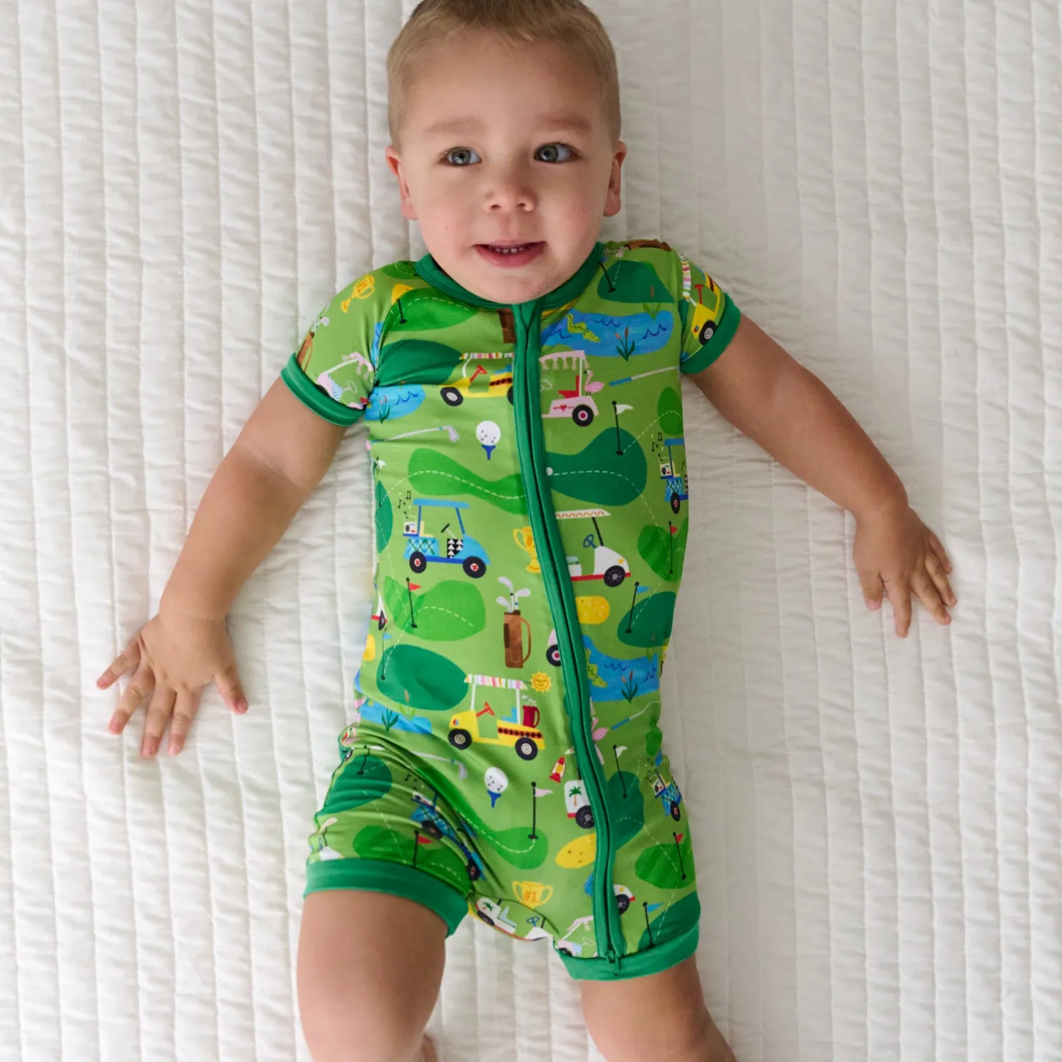 It’s tee time for your little golfer! This grass green Shorty Zippy features a playful print packed with golf course favorites — caddies, flags, trophies, and more. Made from our signature Lunaluxe® Bamboo, with thoughtful features like a double-zipper that extends down the leg & no scratchy tags. Score big with styles for full family matching!