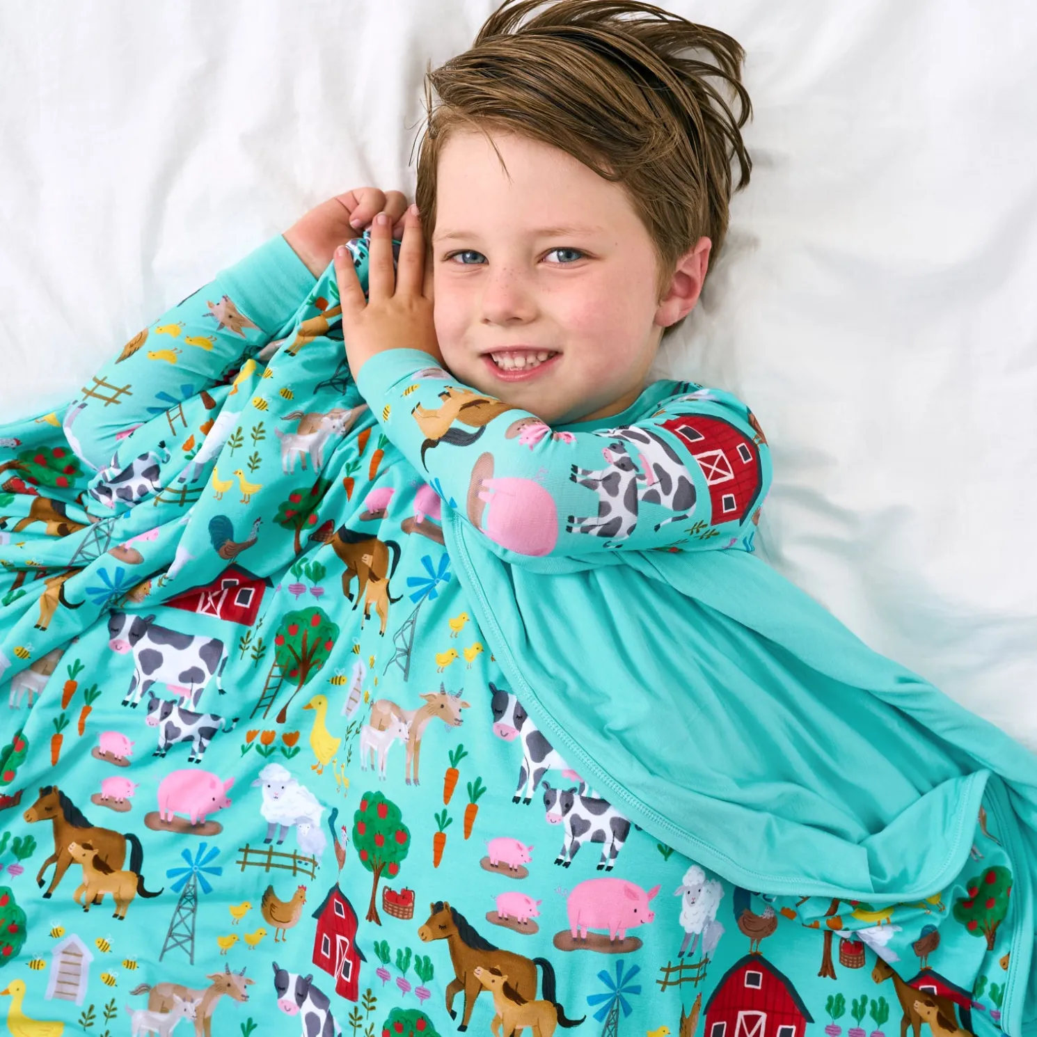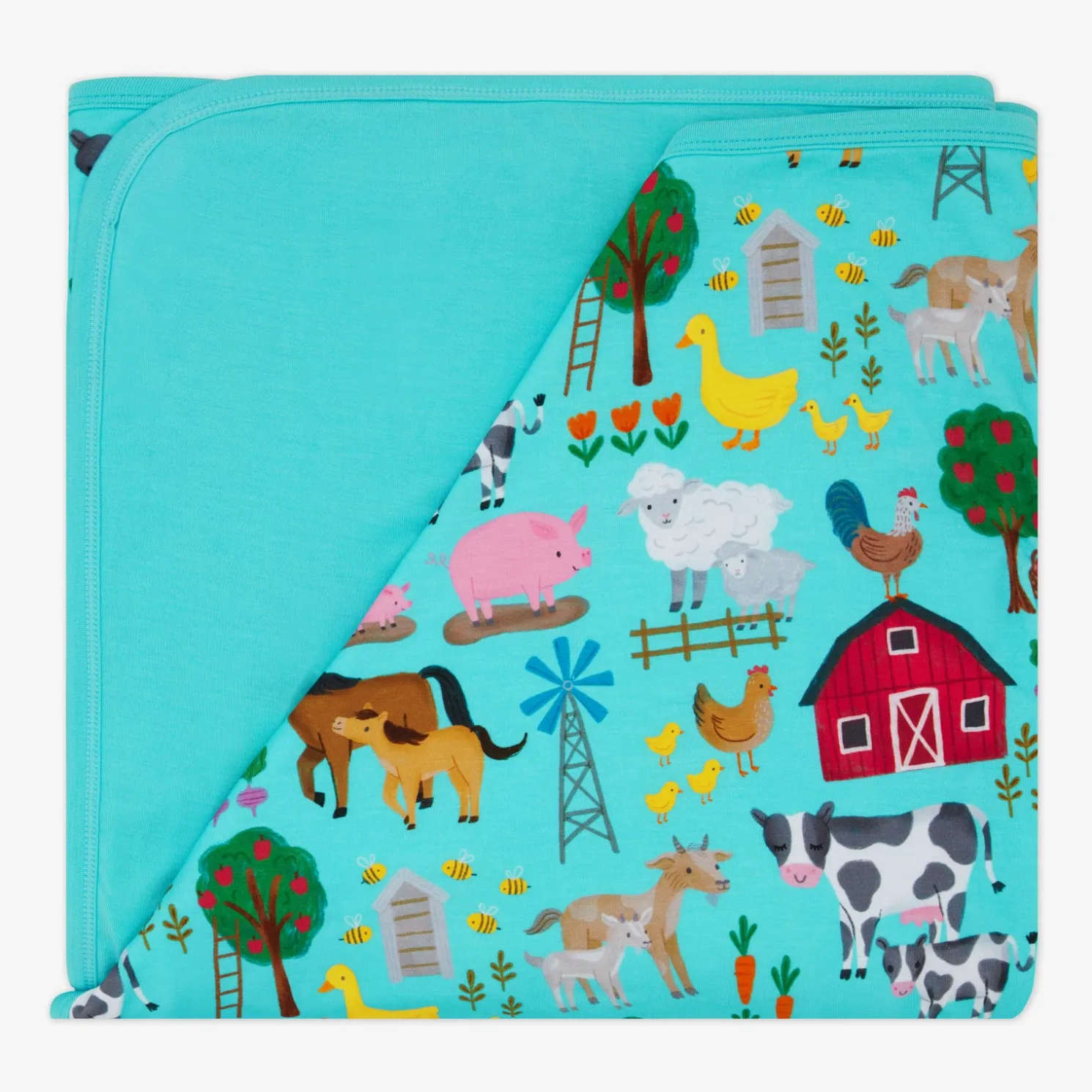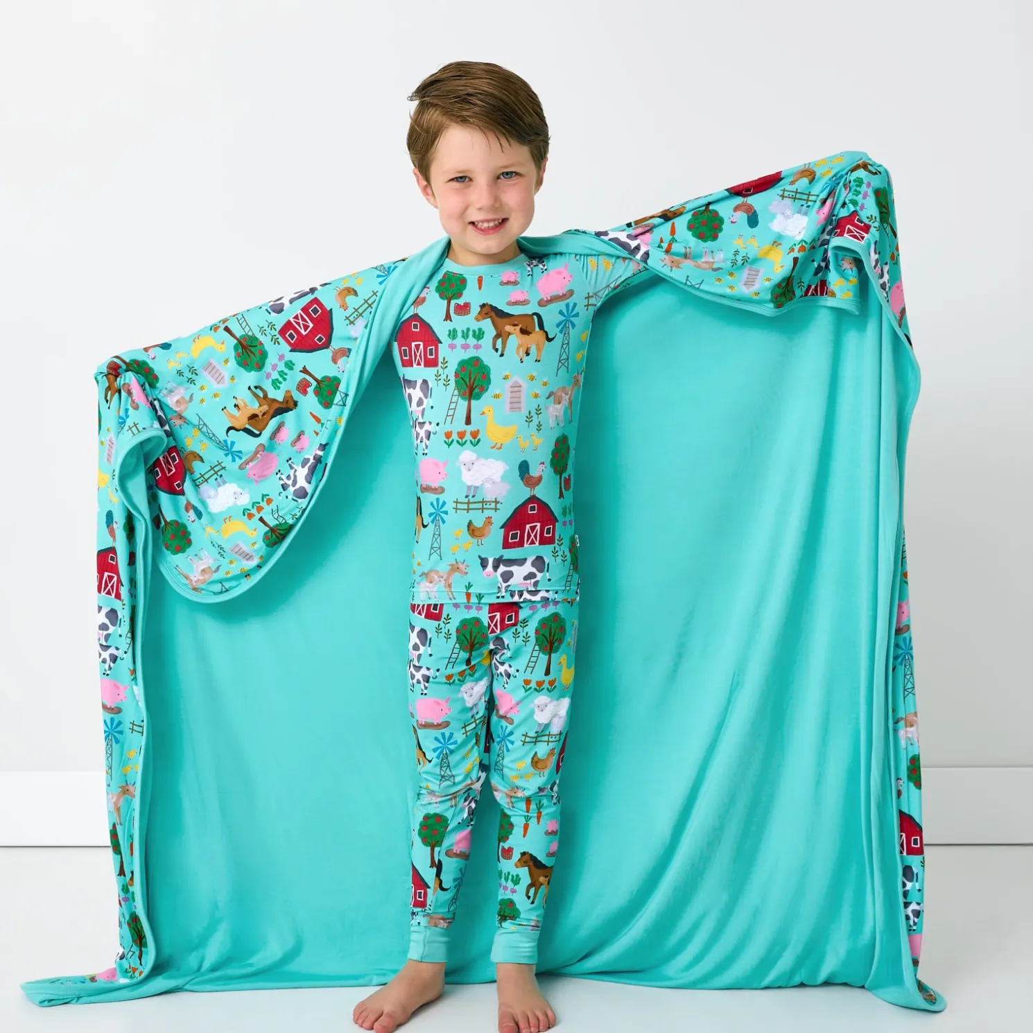 Snuggle up, little farmers! This bamboo blanket features adorable barnyard friends on a cheerful teal blue backdrop. Made from triple-layered Lunaluxe® Bamboo, the Farm Fam Large Cloud Blanket® is gentle on sensitive skin with seasonless comfort for year-round cuddles. Generously sized with a coordinating solid backing, it’s perfect for hittin’ the hay. Pair with the matching pajamas for even more cuteness!