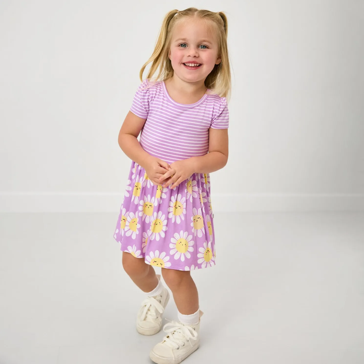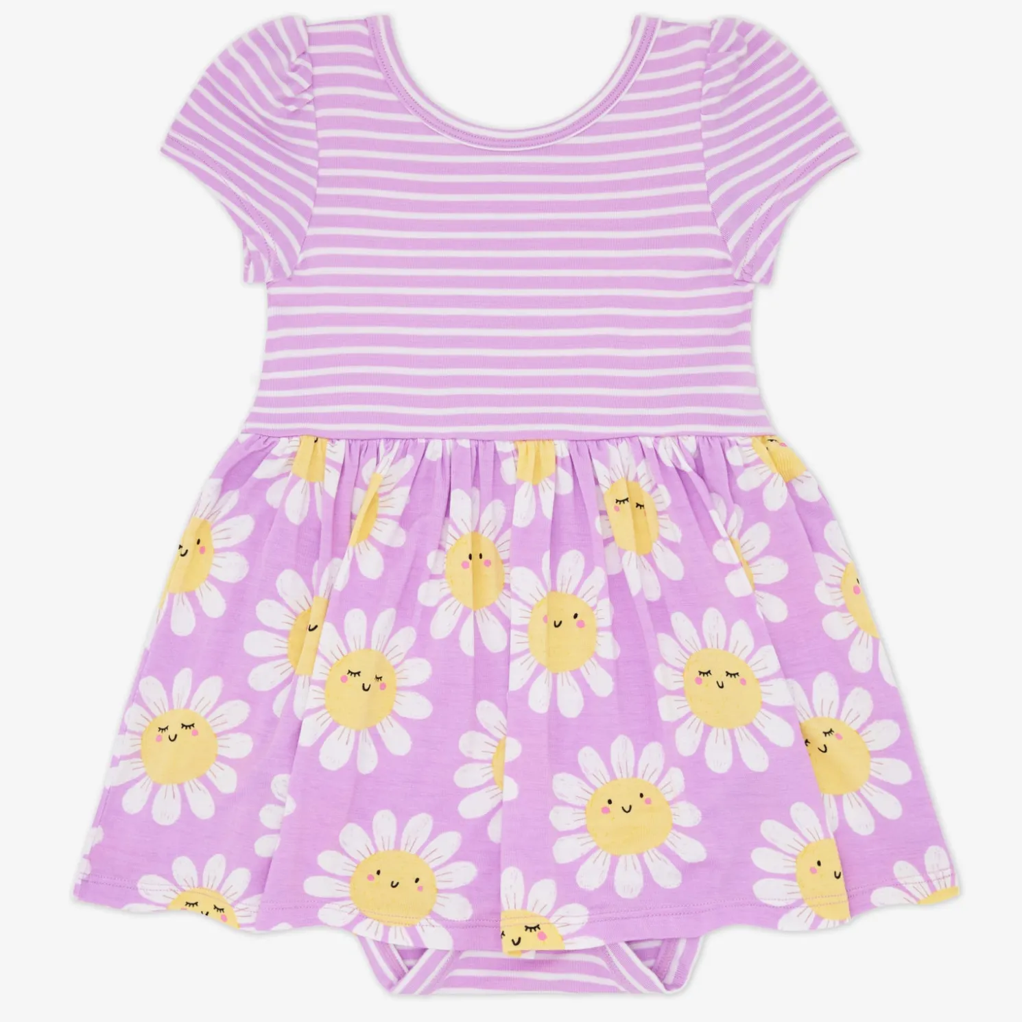 Print Description: The Flower Power Skater Dress with Bodysuit features sleepy and smiley daisies on a light purple background. The bodice and hidden bodysuit are light purple with white micro stripes.