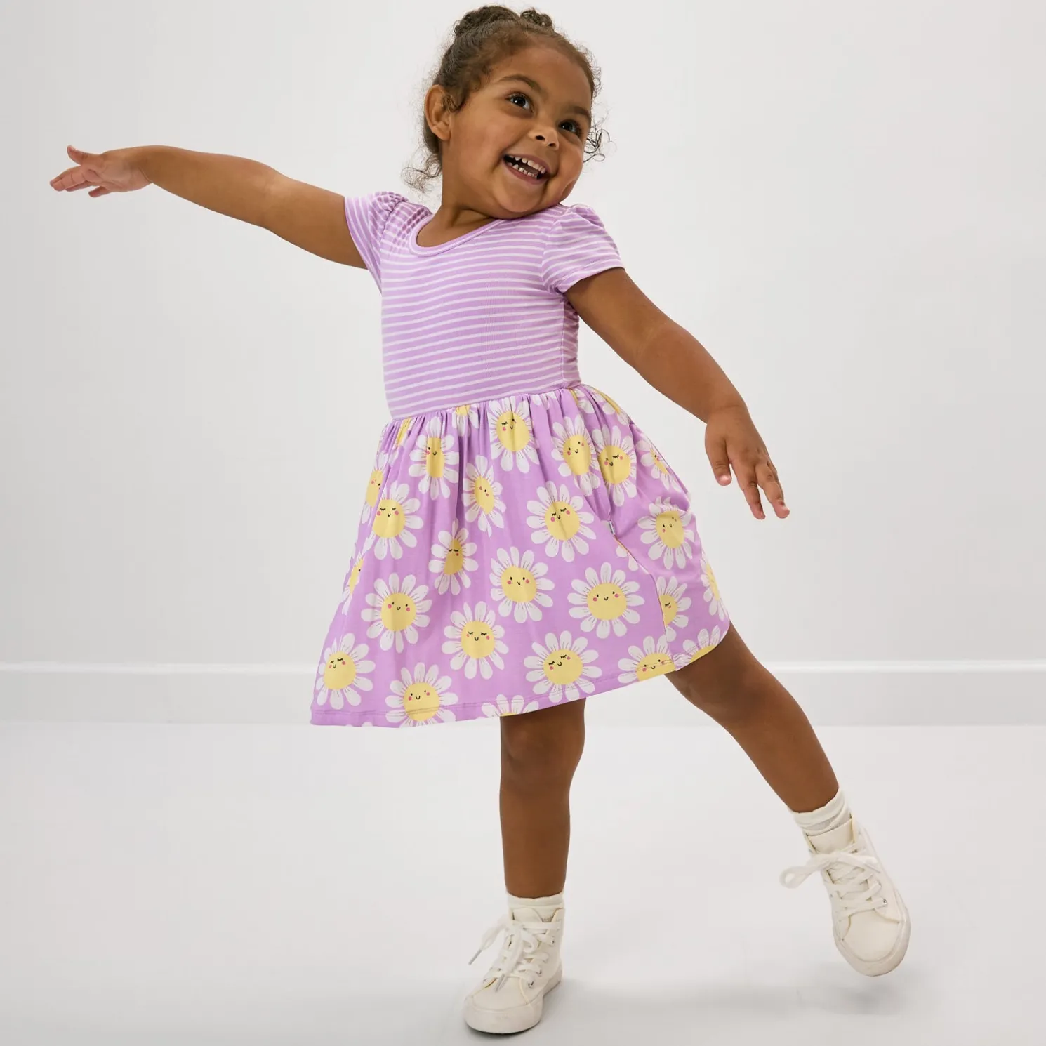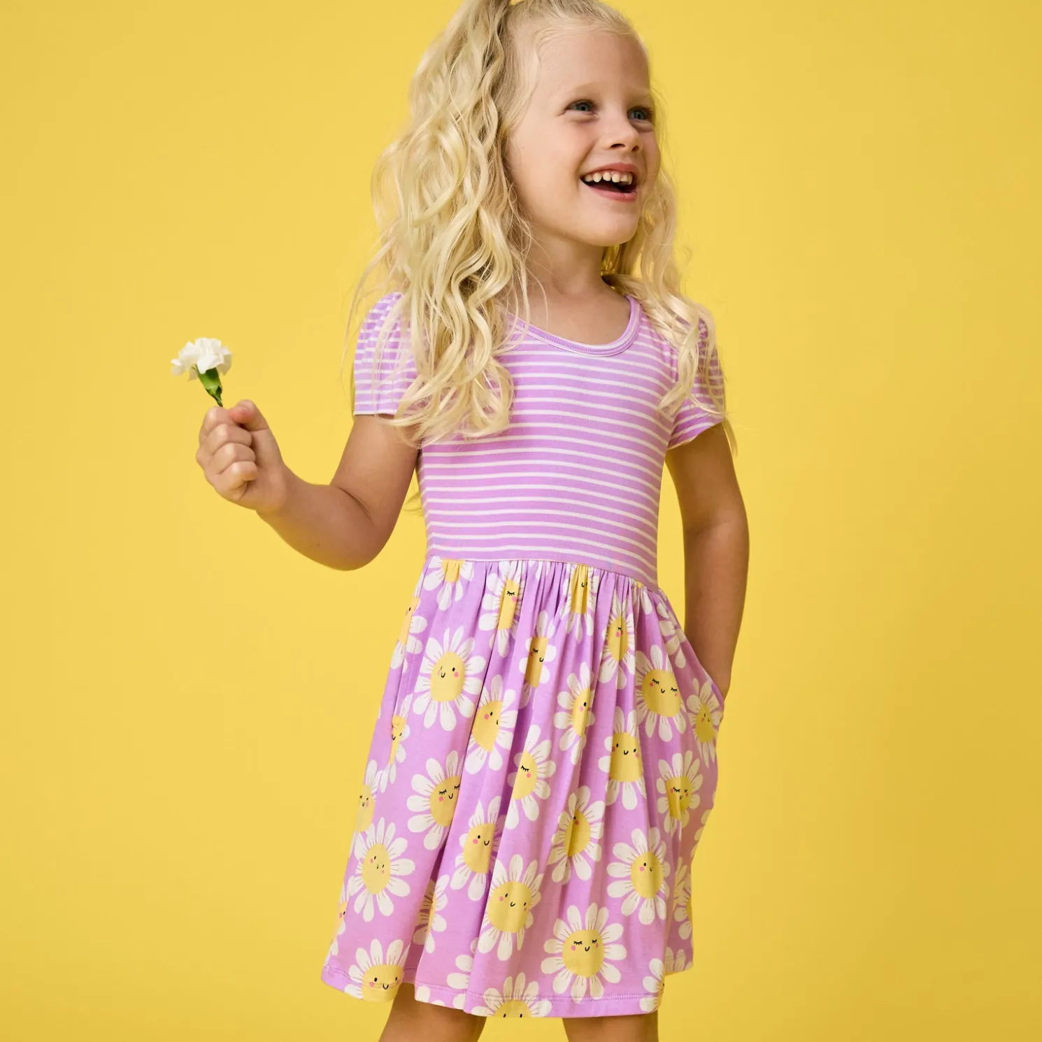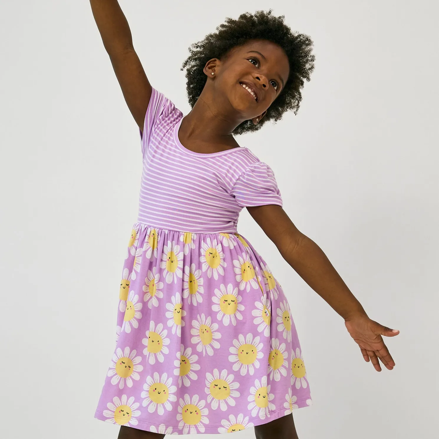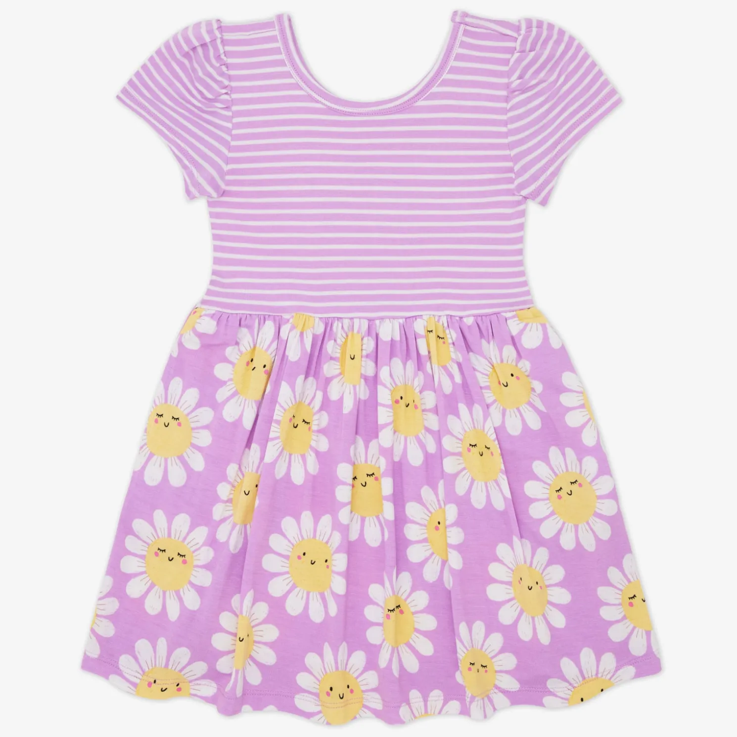 Print Description: The Flower Power Skater Dress features sleepy and smiley daisies on a light purple background. The bodice is light purple with white micro stripes.