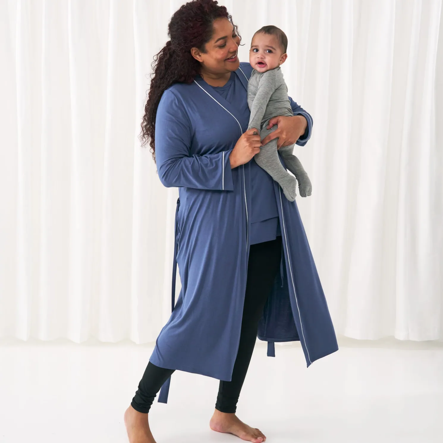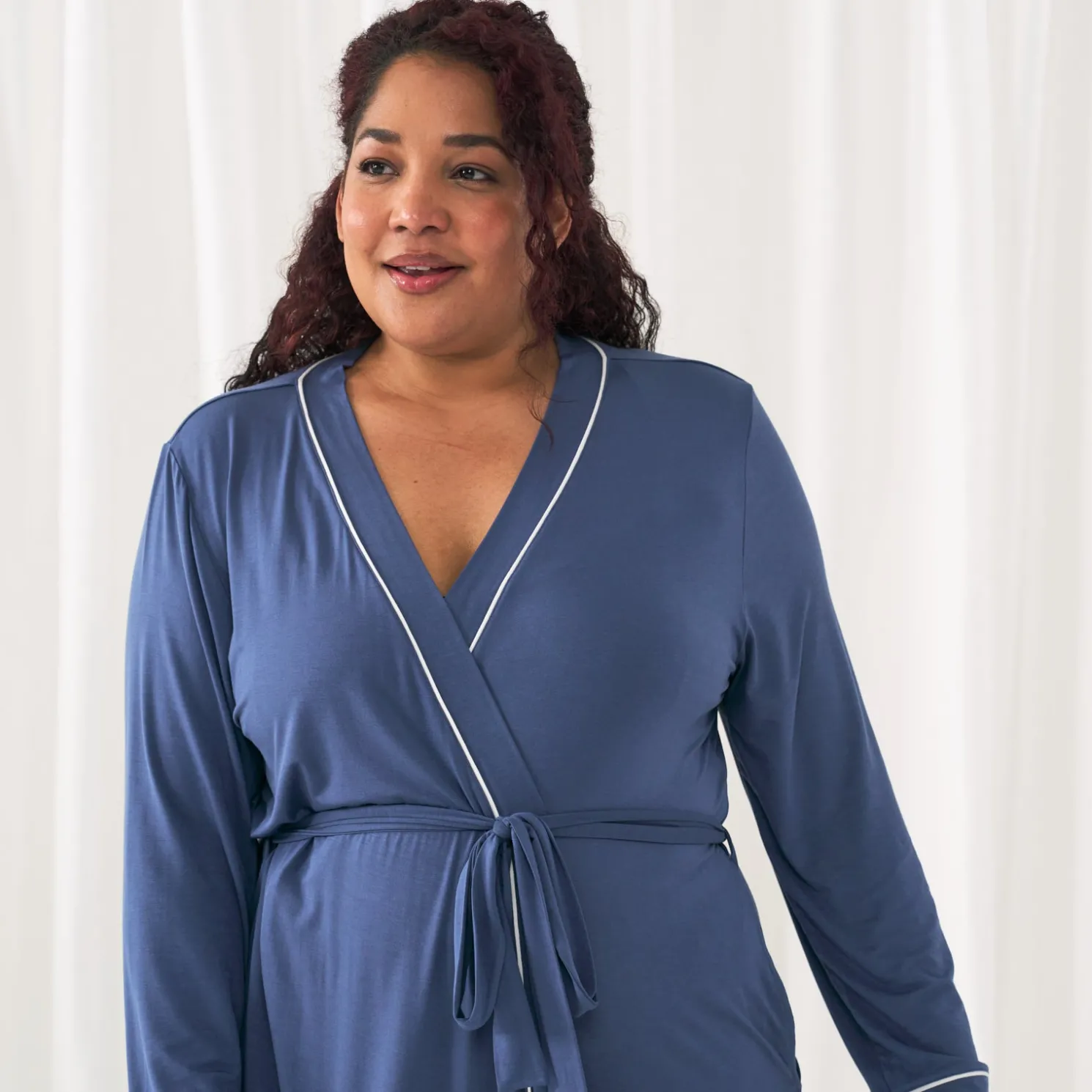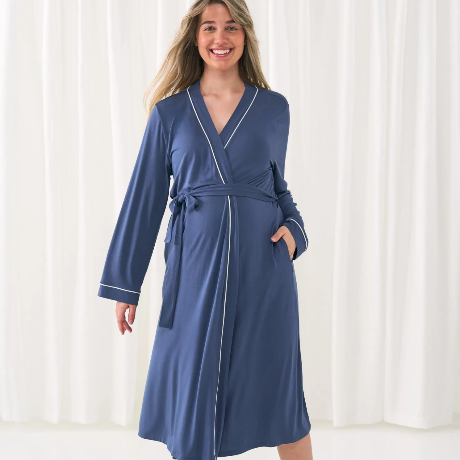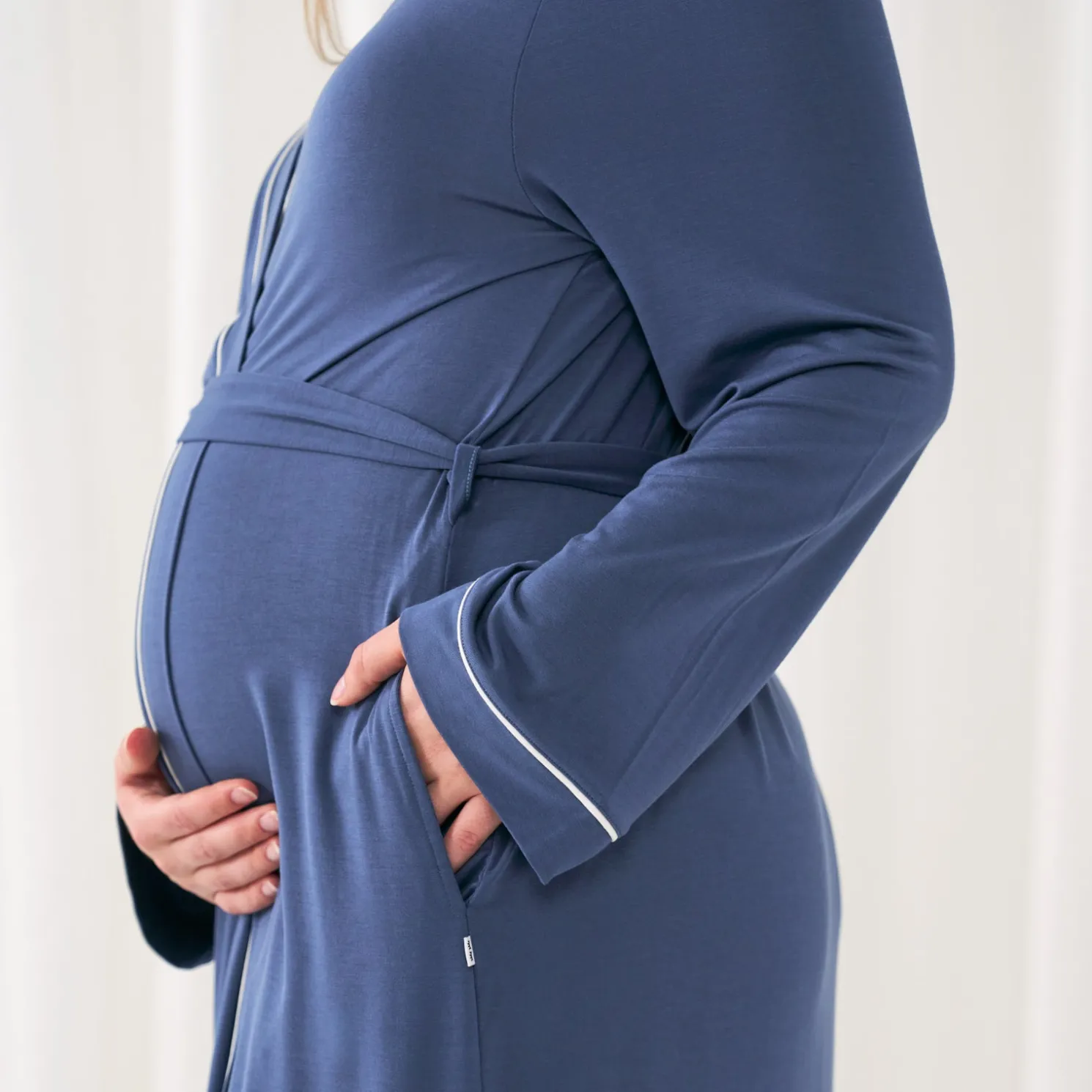 Our new women’s robes are designed for each stage of mama-hood — but also, just everyday coziness! Made from buttery soft Lunaluxe® Bamboo, this comfy indigo robe has deep pockets, an adjustable belt and contrast piping for a cute & classic look.