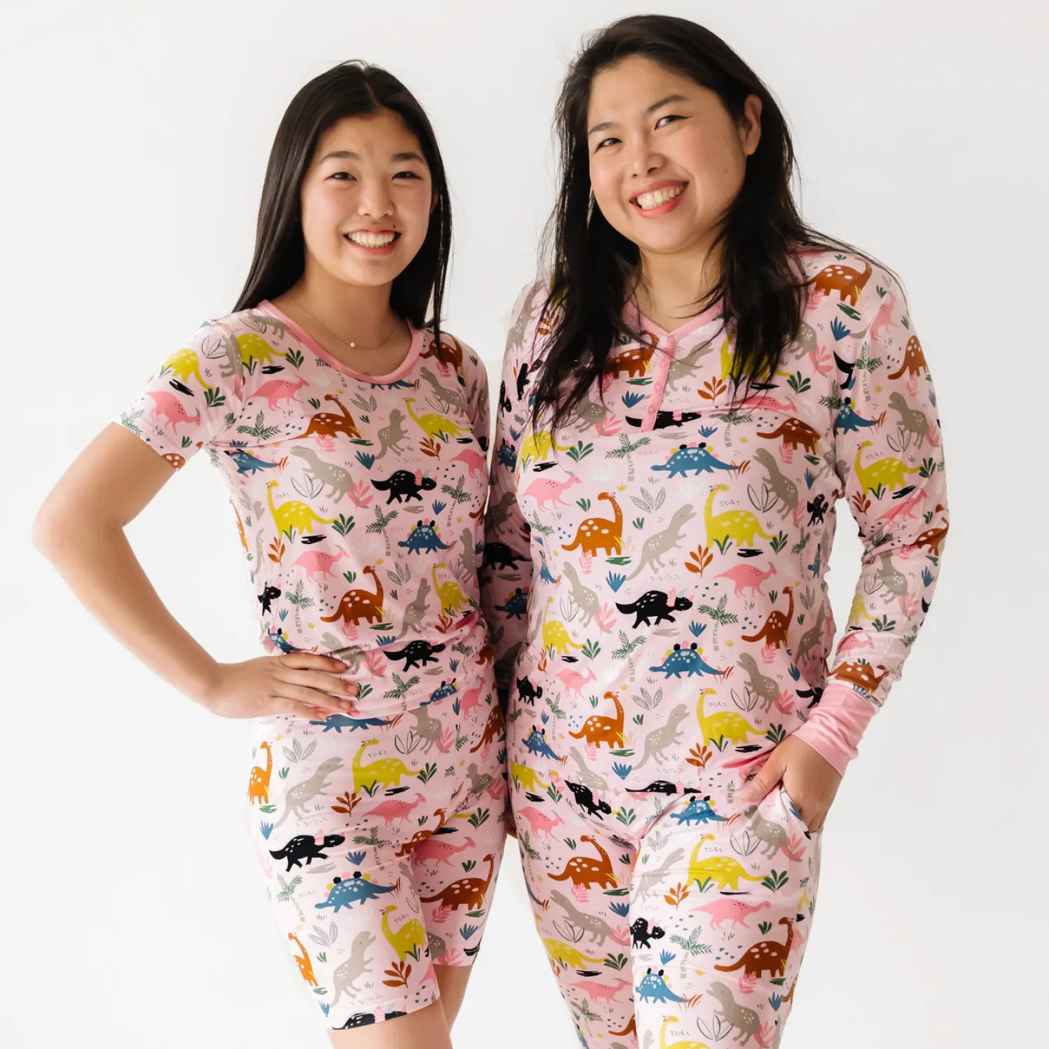Get ready to roar with the kiddos in this dino-mite print. Featuring all their (and your) favorite dinosaurs on a soft pink background, this PJ Top is crafted from our custom-milled Lunaluxe® Bamboo, complete with front snaps for nursing ease. Pair it with the matching pants to complete the set, then grab styles for the whole fam!