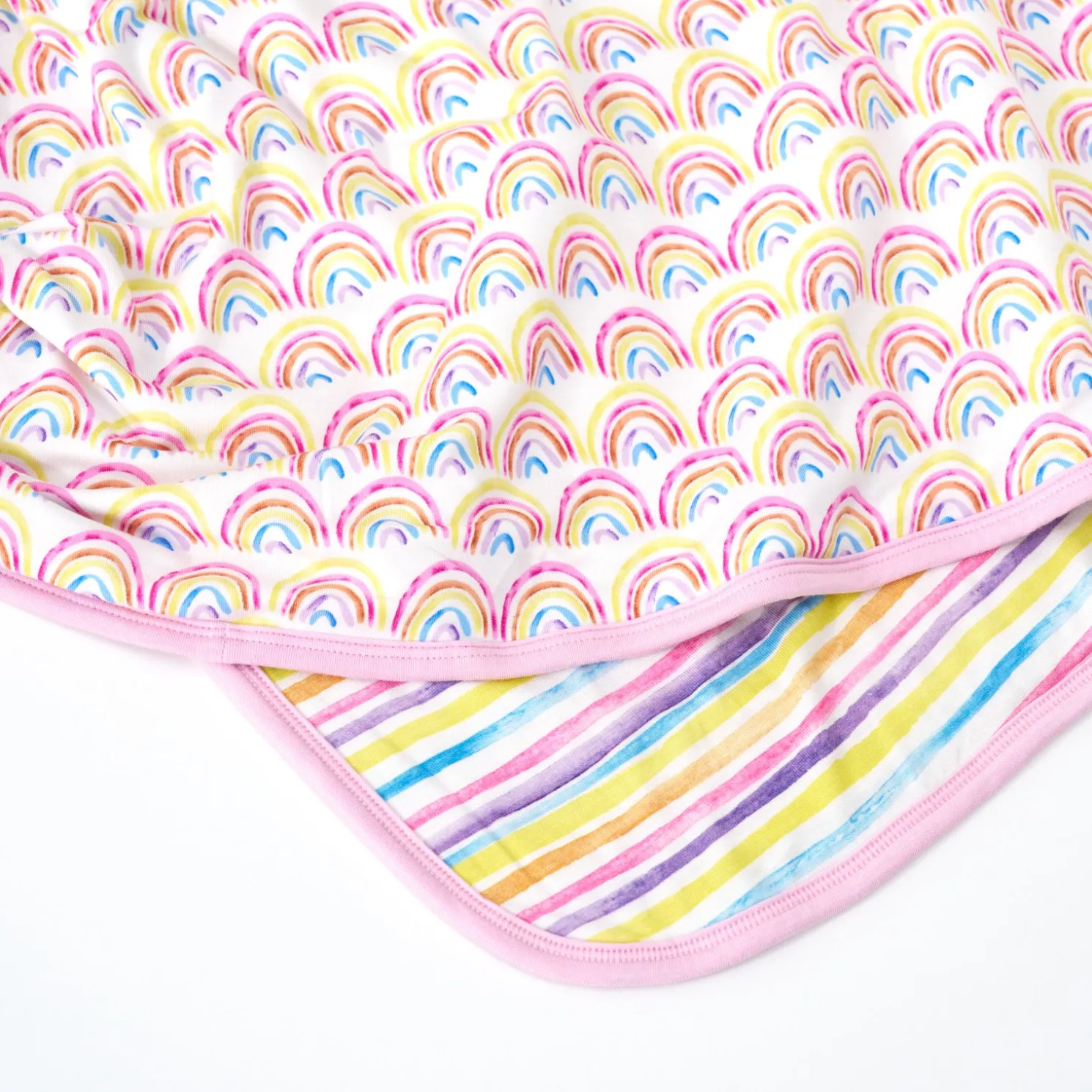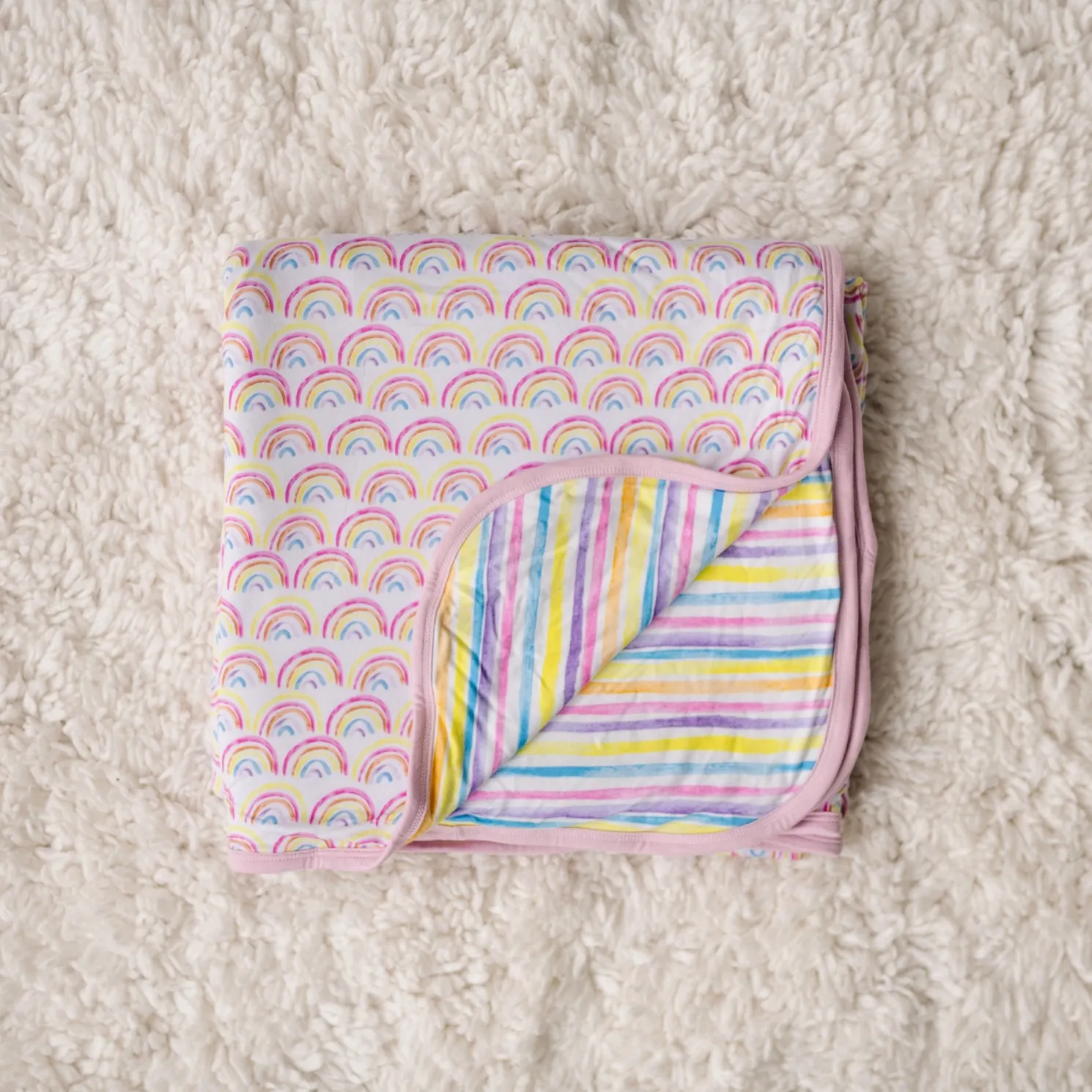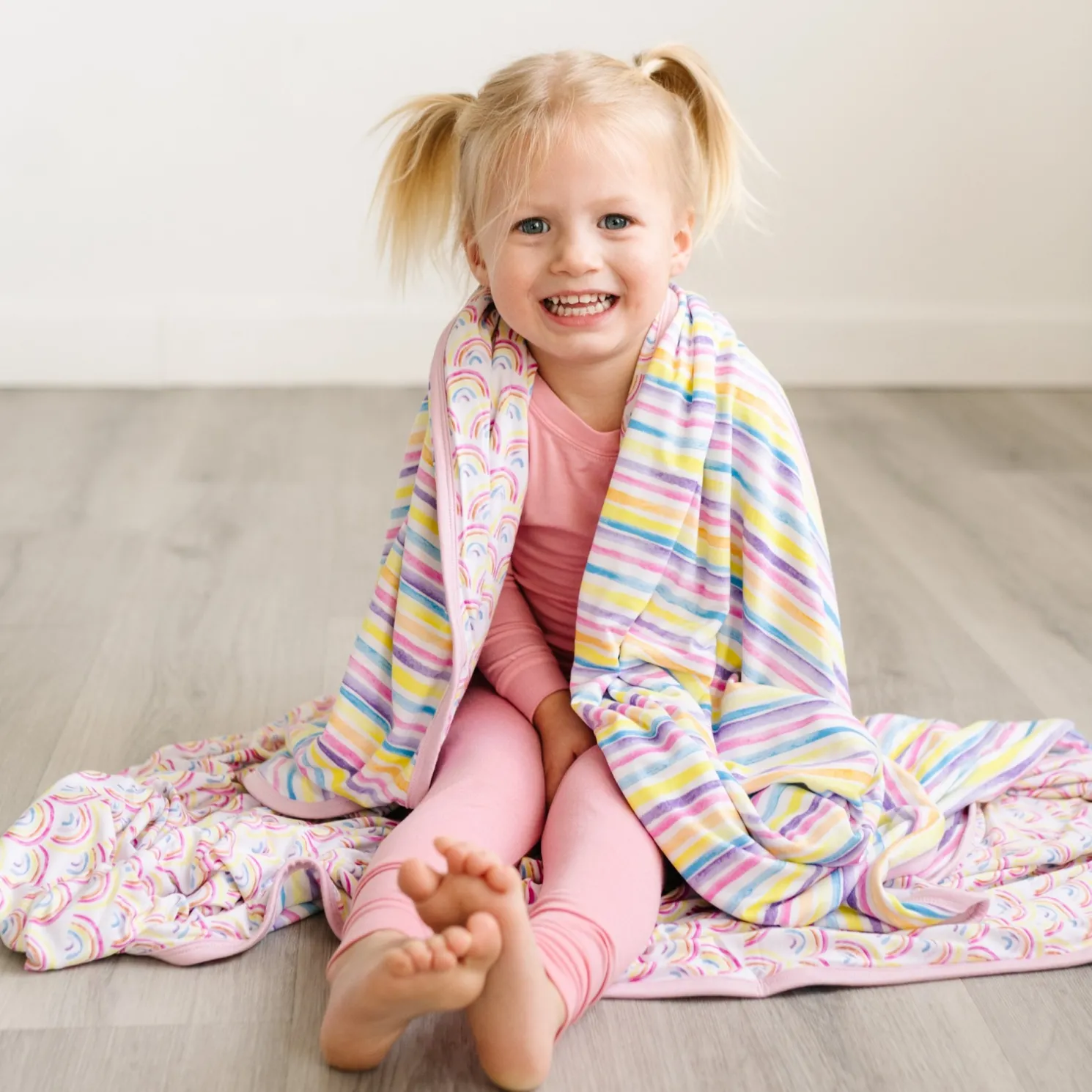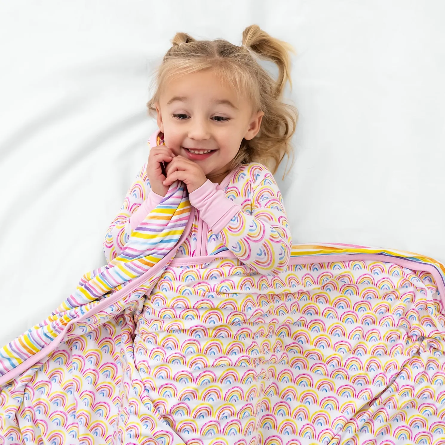 Soft as a cloud, dreamy as a rainbow! This Cloud Blanket® features cheery rainbows in pastel hues with rainbow stripes on the other side. Made from three luxurious layers of our signature Lunaluxe® Bamboo, it’s buttery soft and big enough for cuddles with the kiddos!