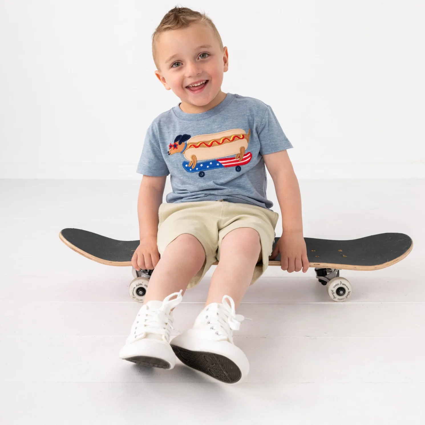 Print Description:The Red, White, and Woof Relaxed Tee is light heather blue with a dachshund dressed as a hot dog. Wearing red star sunglasses, the pup is rolling across the front on an American flag skateboard.