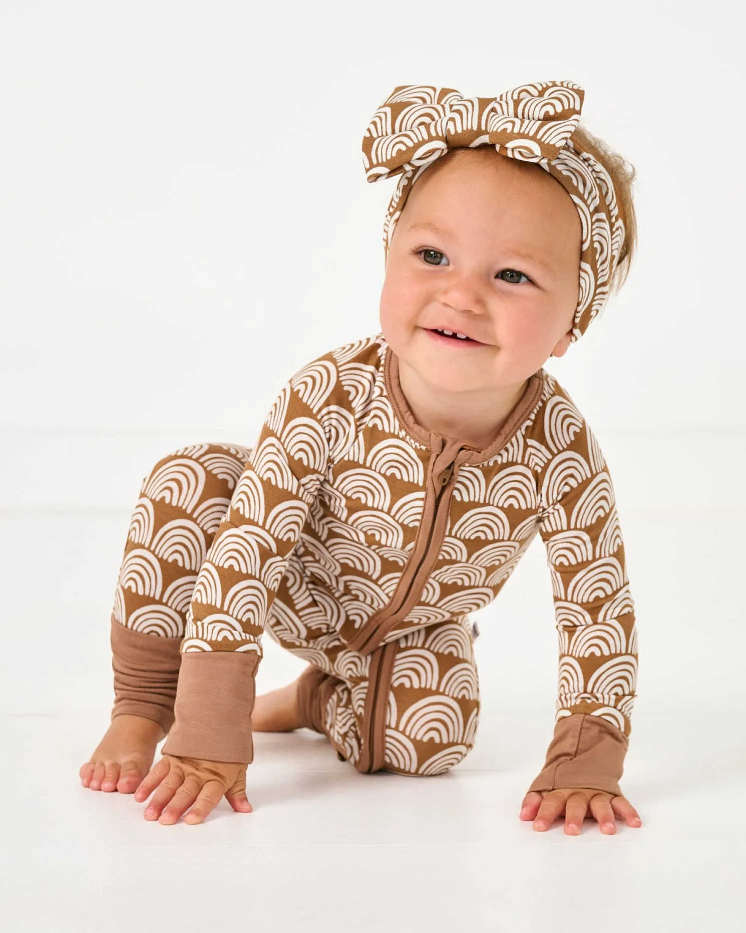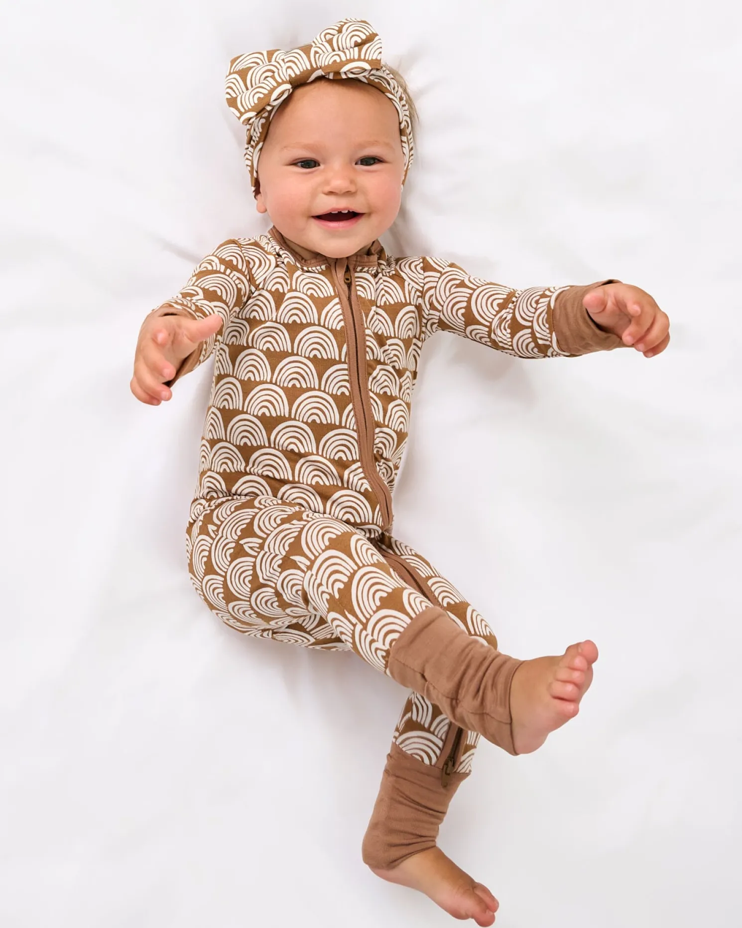 Calling all little dreamers! Featuring white rainbows on a neutral background, Rust Rainbows is a fan-favorite. This Zippy is made from our signature Lunaluxe® Bamboo, with thoughtful features like fold-over feet & mittens, a 2-way zipper, and no scratchy tags. Don’t forget a matching Luxe Bow for the cutest finishing touch!