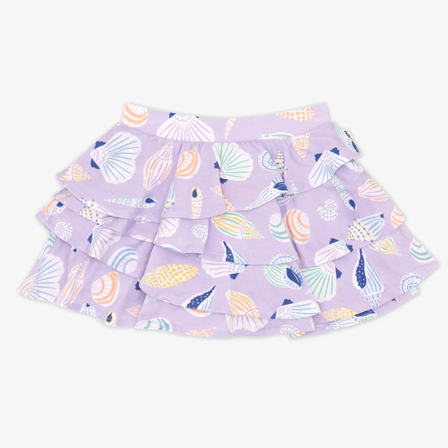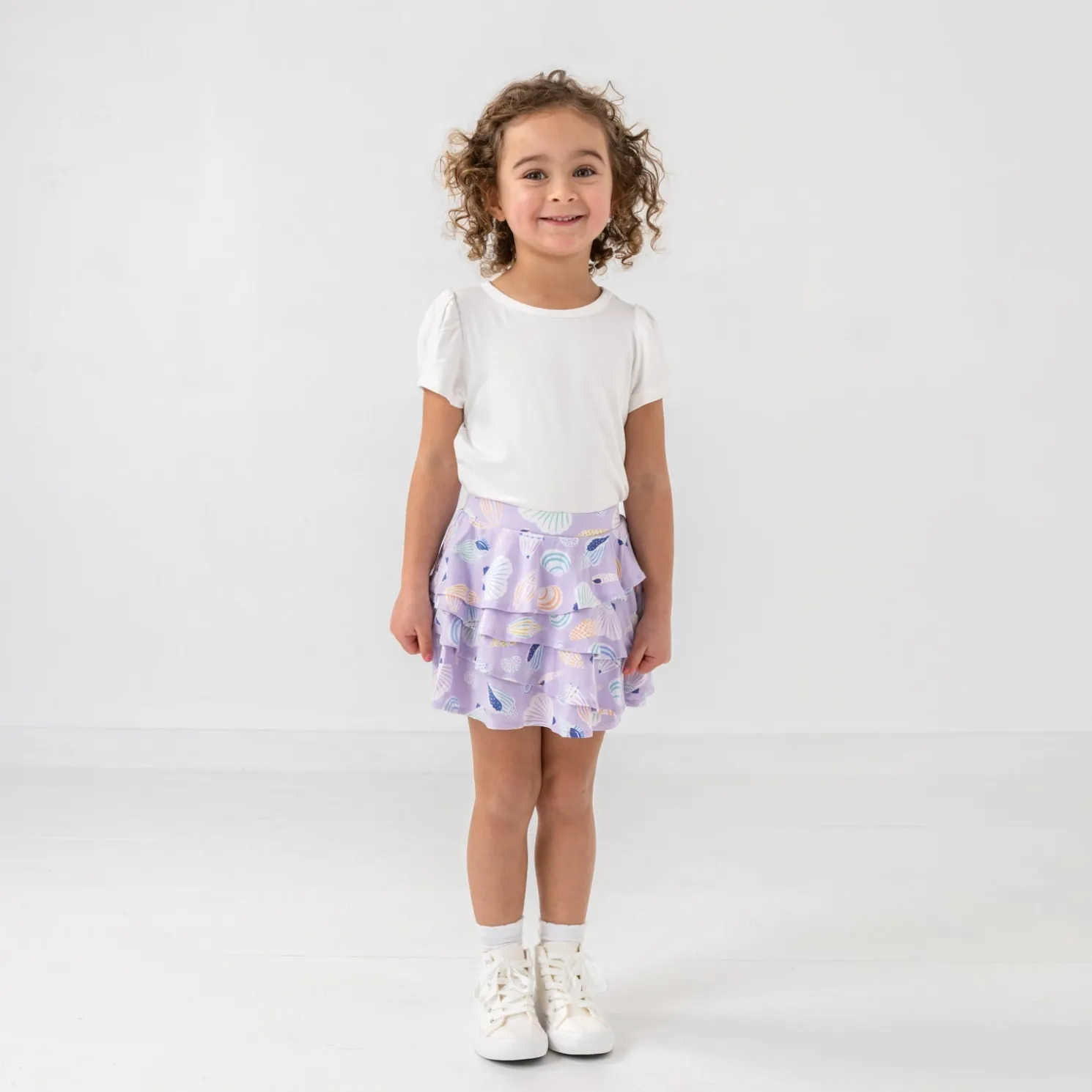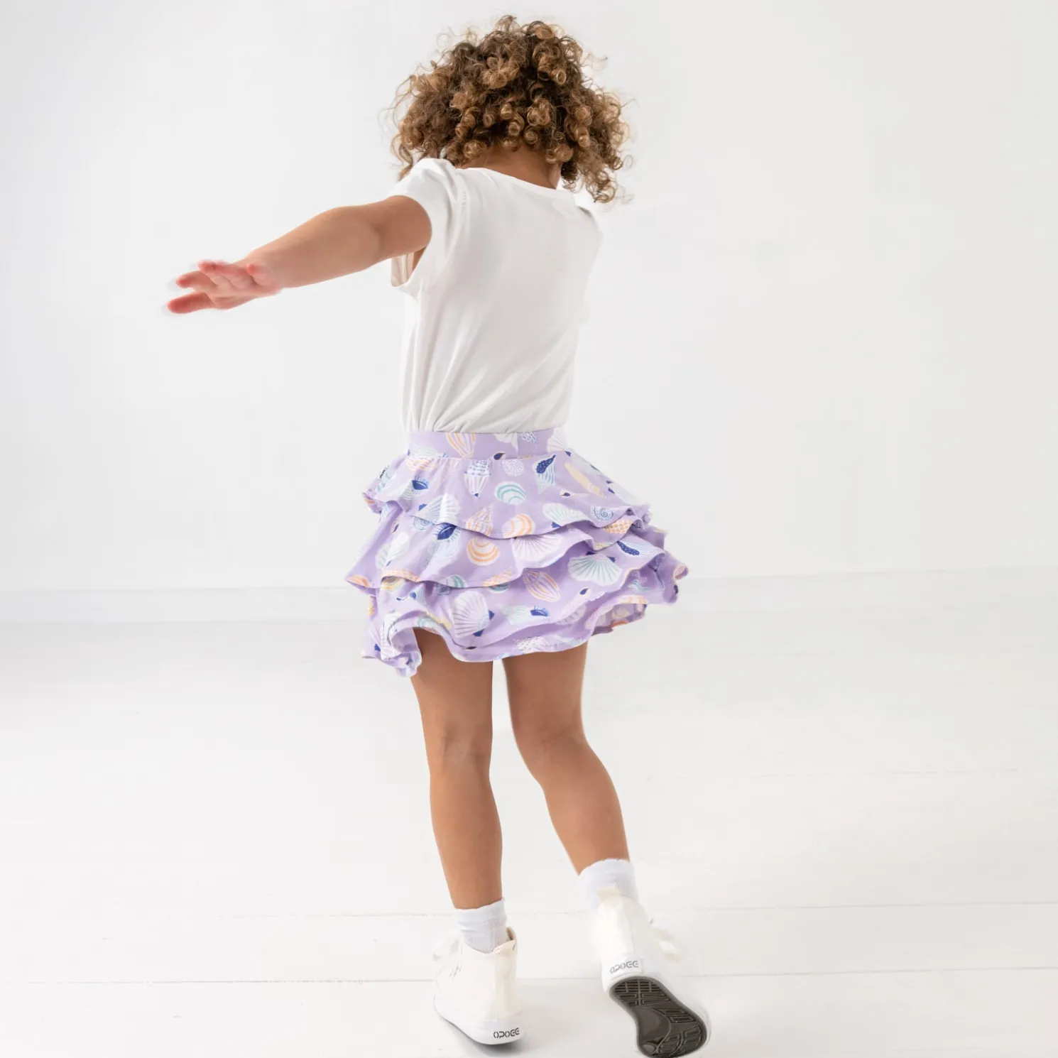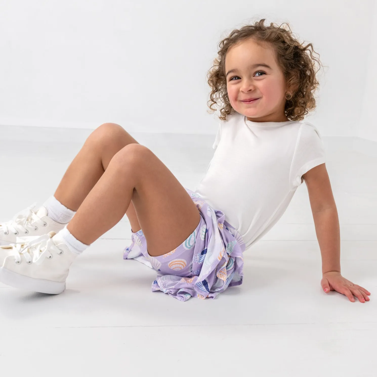Cutest summer skirt ever! Featuring hand-drawn shells on a light lilac background, this pretty Ruffle Skort is made from our super soft and durable Soluxe® Bamboo. It features asymmetrical ruffled skirt layers, plus built-in shorts for carefree fun on the shore.