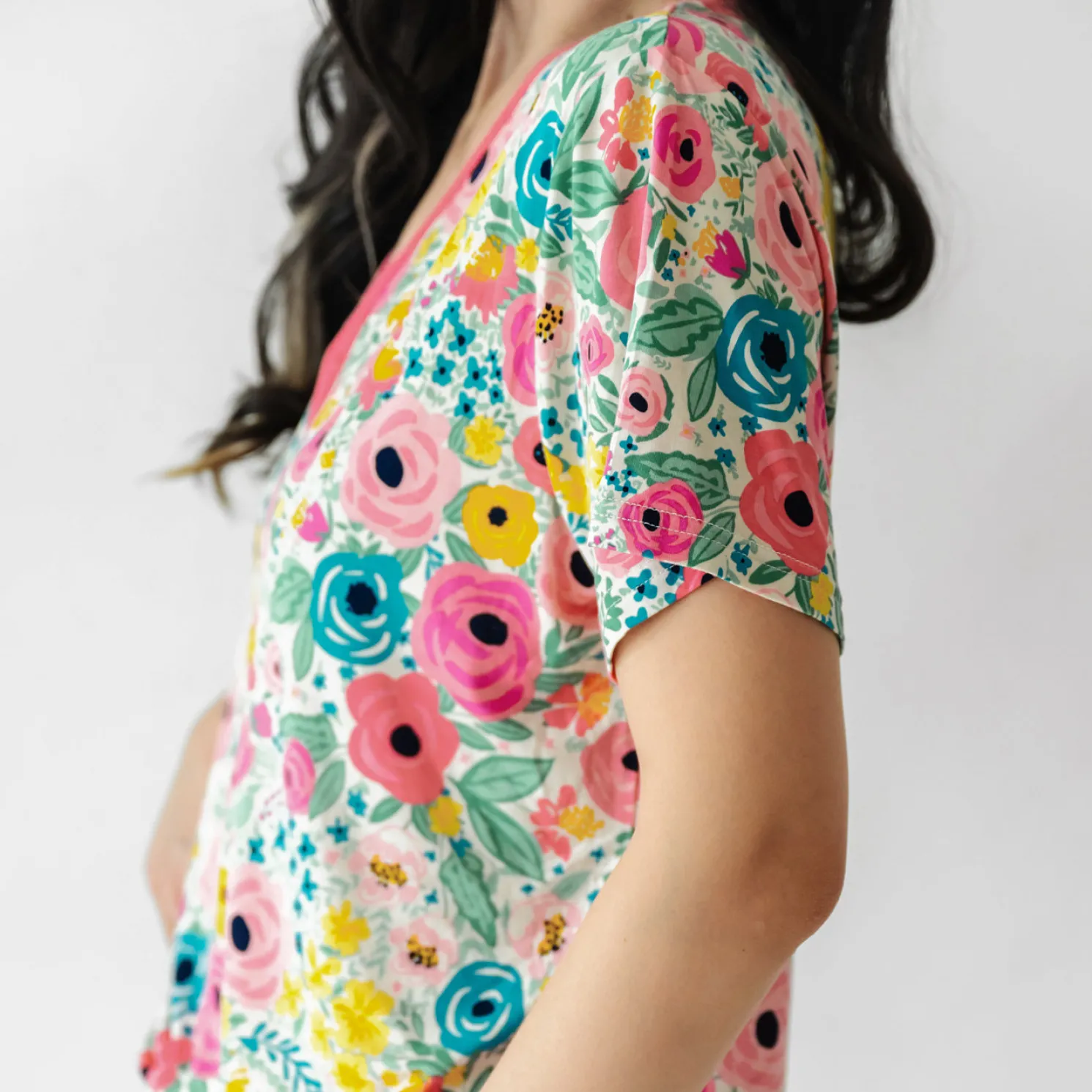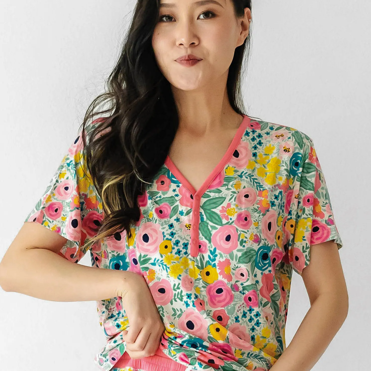The secret’s out, these floral PJs are a LS fan-favorite! Crafted from our custom-milled Lunaluxe® Bamboo, this PJ Top has front snaps for nursing ease. The short sleeve style is perfect for warmer weather. Pair it with the matching shorts, then grab styles for mommy & me moments!