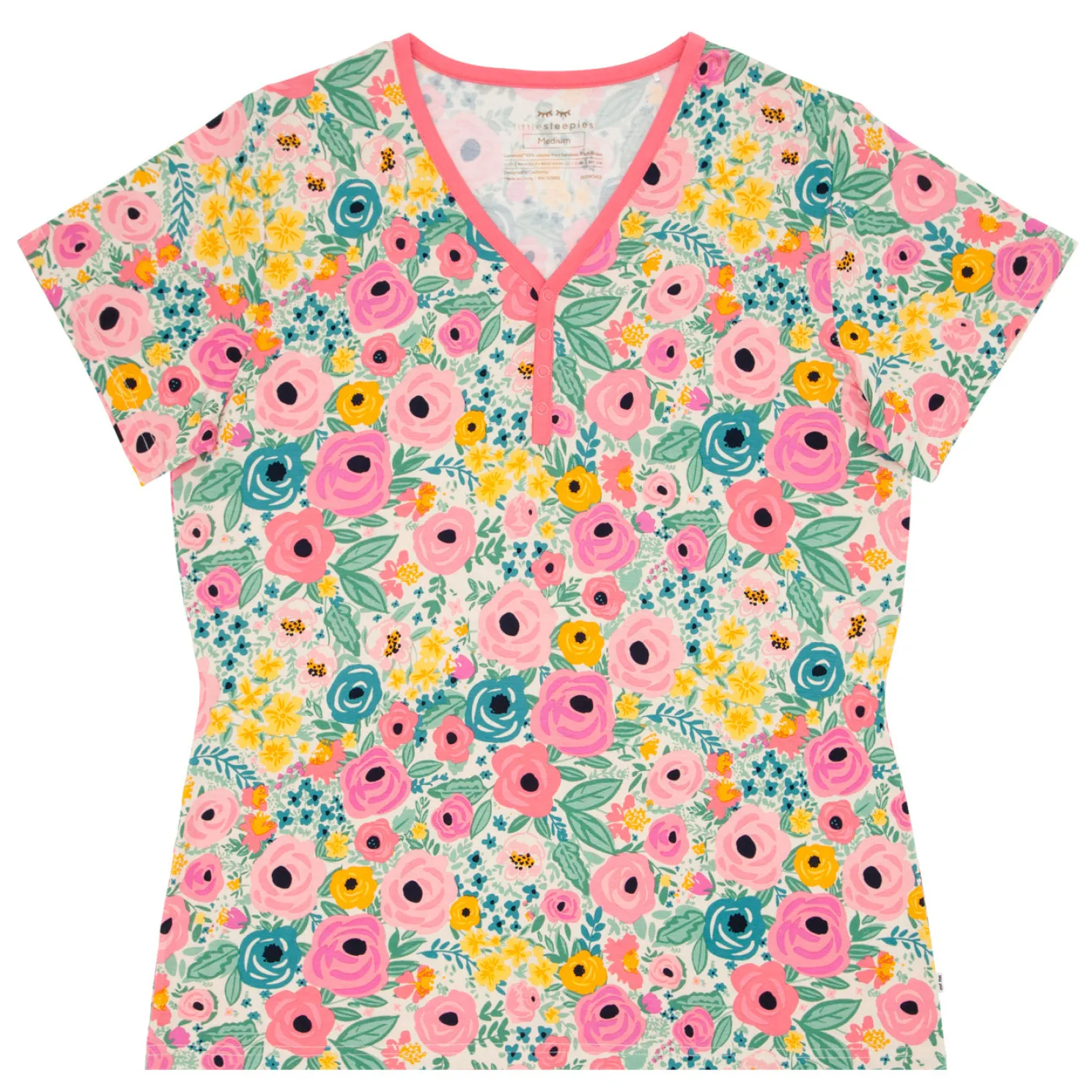 - Henley snap-front placket for easy nursing access