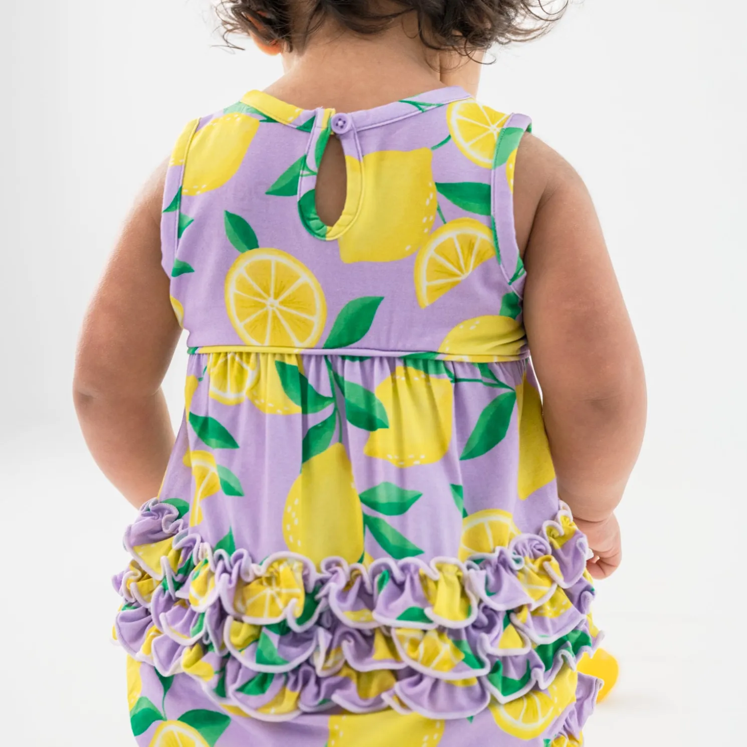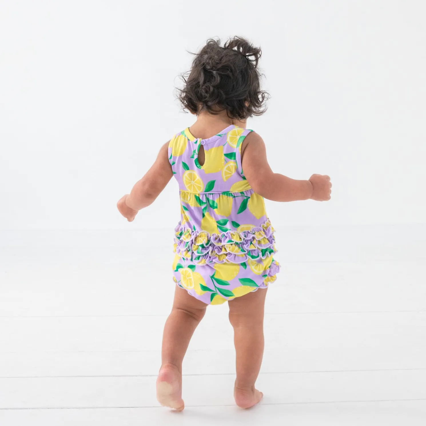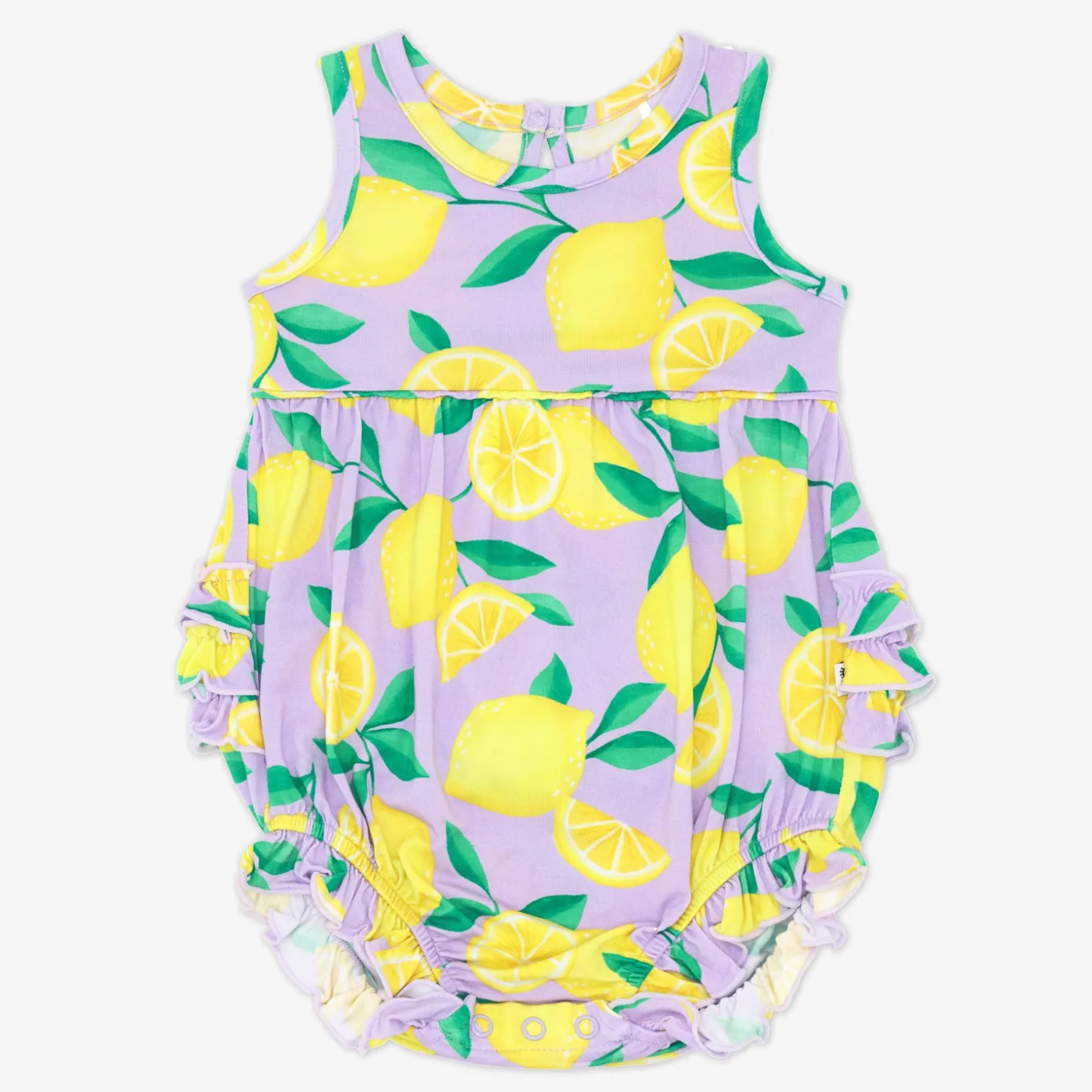Squeeze the day in the sweetest romper around! Made from ultra-soft and durable Soluxe® Bamboo, the Sunny Citrus Bubble Romper features bright lemons on a soft lavender background. With a relaxed fit, breathable jersey fabric, and tagless comfort, it’s perfect for all-day Play. Snaps make diaper changes easy peasy, while ruffle details and a keyhole button back add extra sweetness!