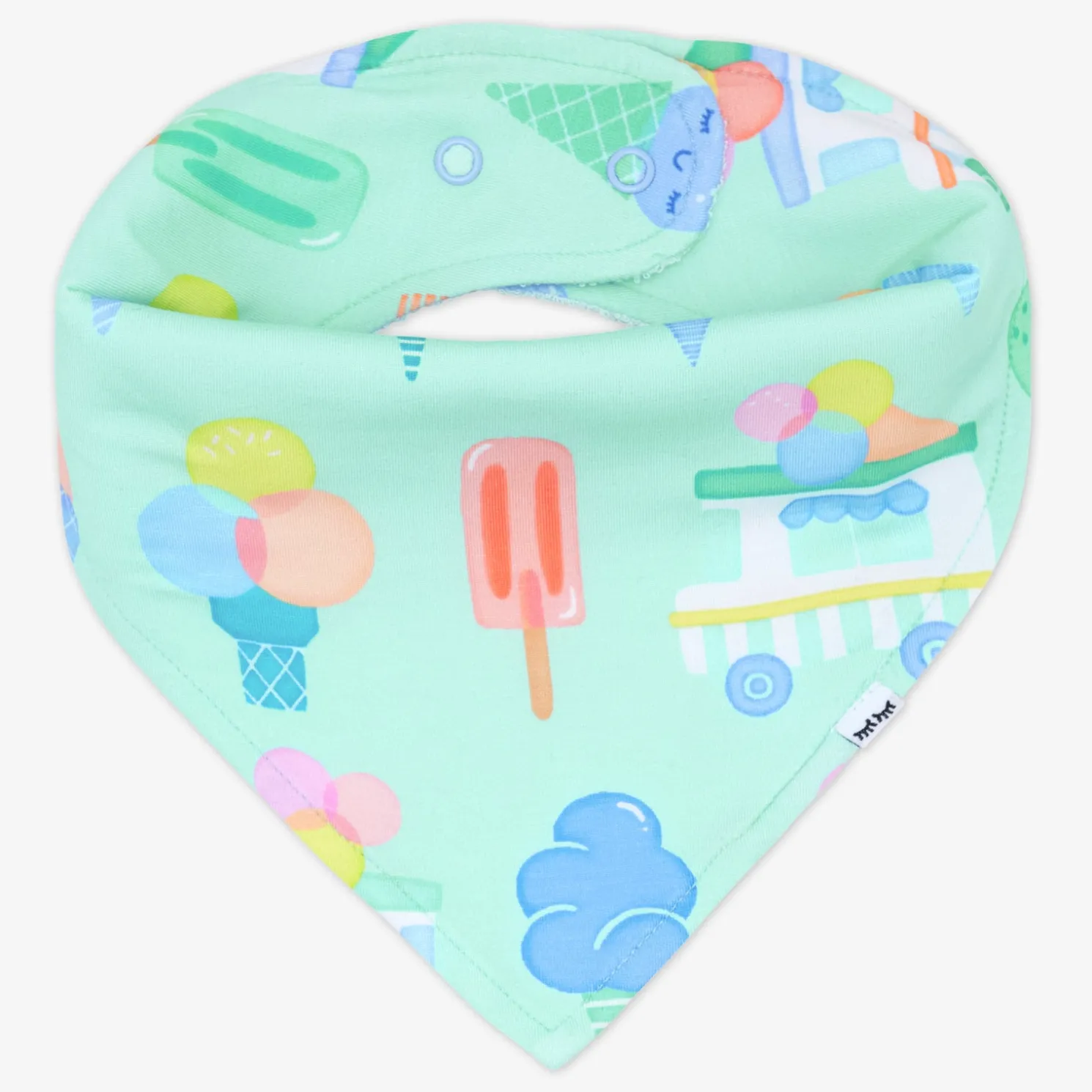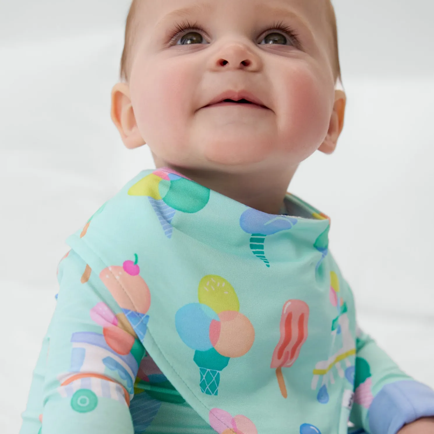 A sweet treat for messy eats! Dribbles, drool, and snack-time spills? No worries — the Sweet Scoops Bandana Bib has you covered! Sprinkled with rainbow ice cream cones, popsicles, and cotton candy on a dreamy aqua blue, it’s as cute as it is cool! Made from absorbent bamboo with a terry backing to keep little chins dry, it’s perfect for mealtime or teething moments.