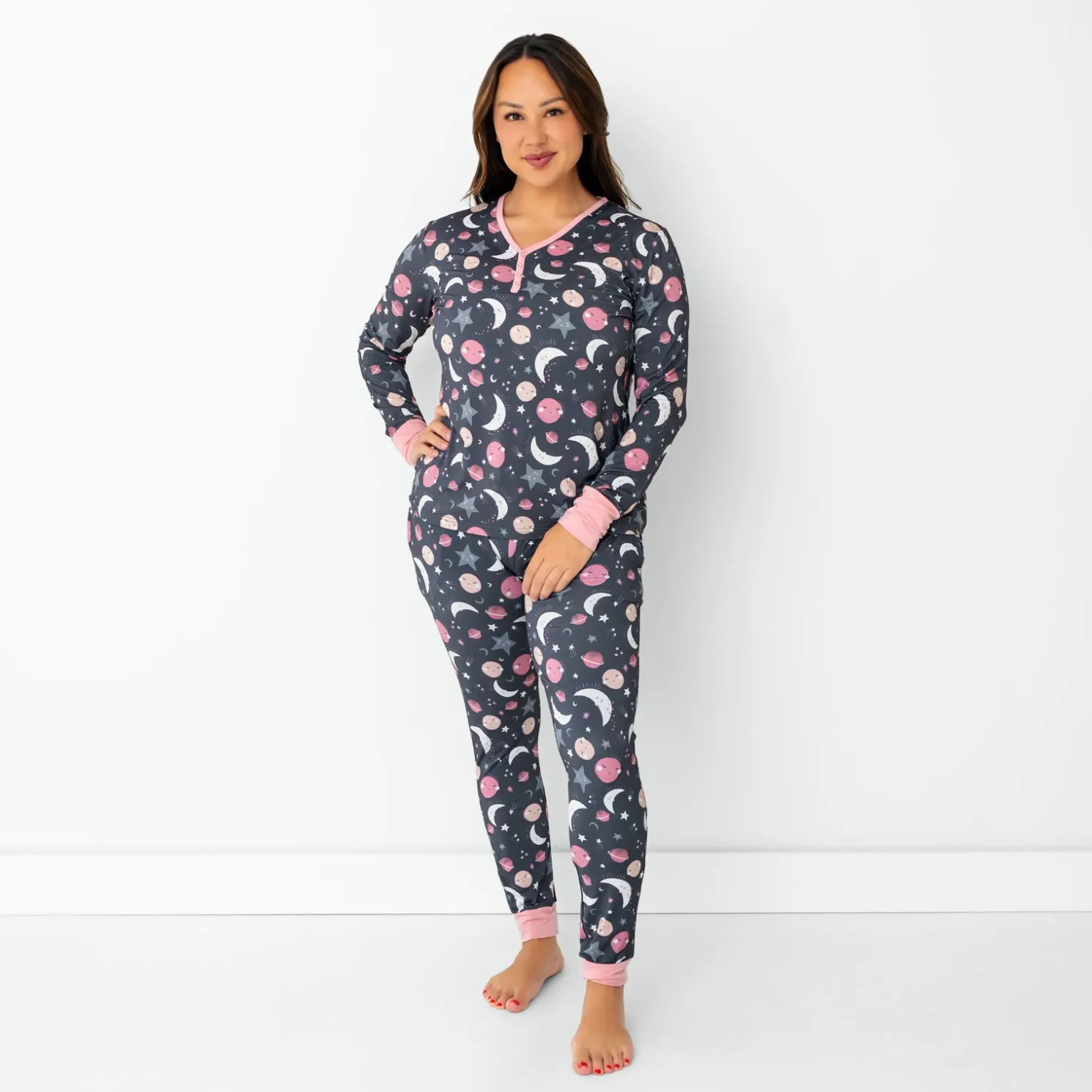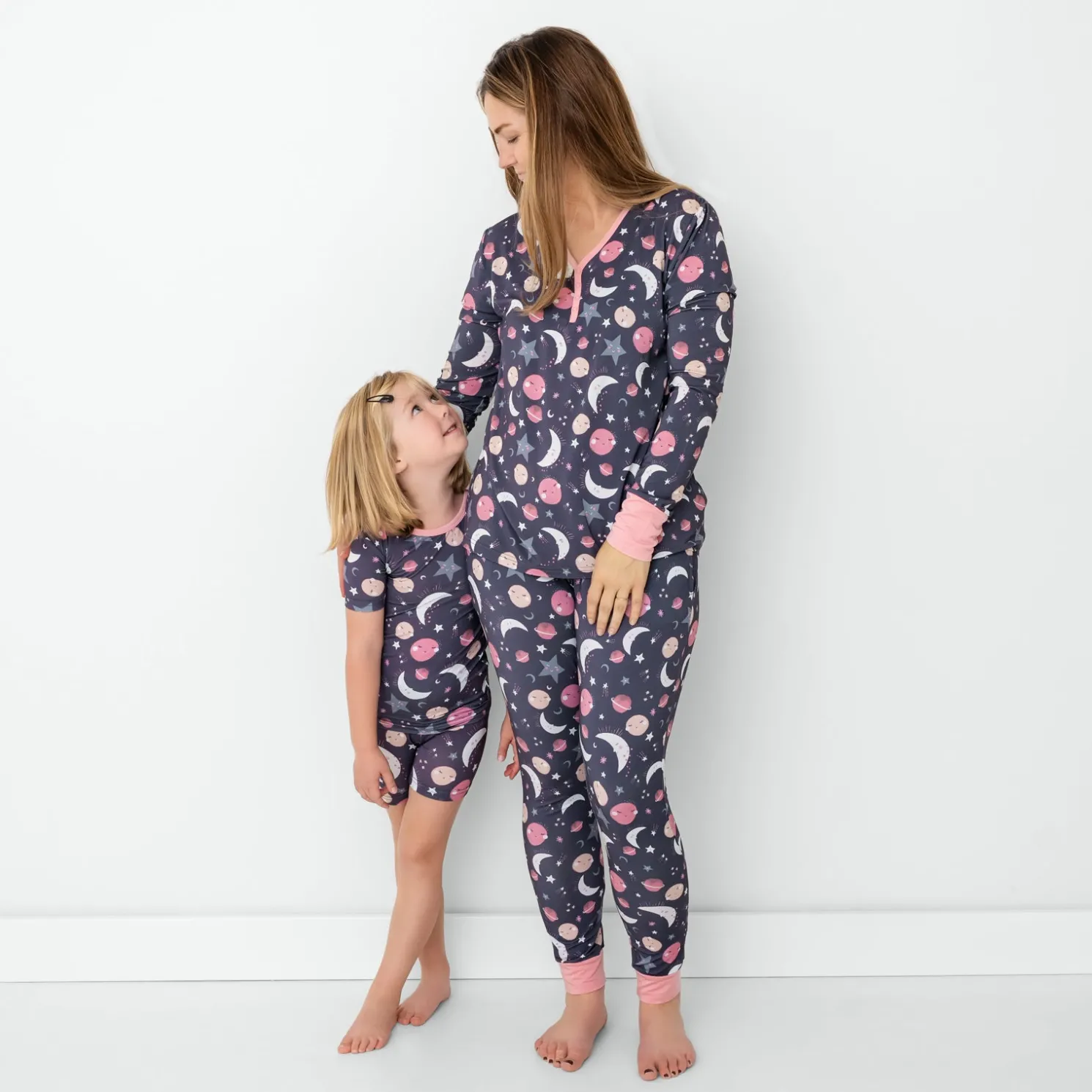 Dream up a galaxy of fun with your kiddos! Featuring pink moons, stars and planets in deep gray skies, these jogger-style PJ Pants are made from buttery soft Lunaluxe® Bamboo. Designed by a mama, they feature stretchy ankle cuffs and pockets deep enough for all your must-haves. Pair them with the matching top to complete the set, then grab matching styles for the whole family!