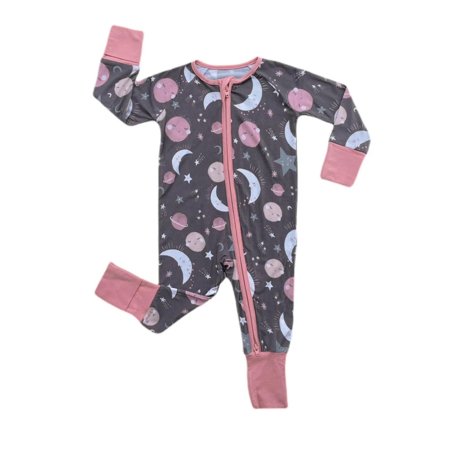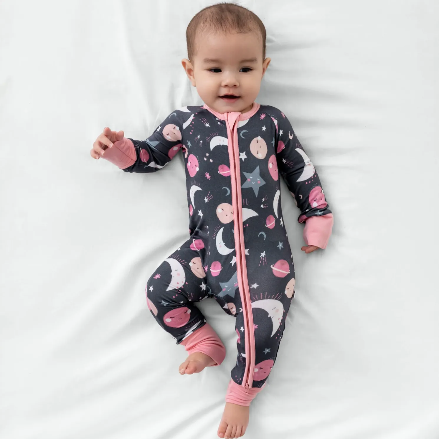 Sweet dreams await! Featuring pink moons, stars and planets in deep gray skies, this adorable one-piece zipper pajama is crafted from our signature Lunaluxe® Bamboo. Designed with comfort in mind, it features fold-over feet and mittens, a convenient 2-way zipper, and no scratchy tags. Snag styles for mommy & me matching moments!