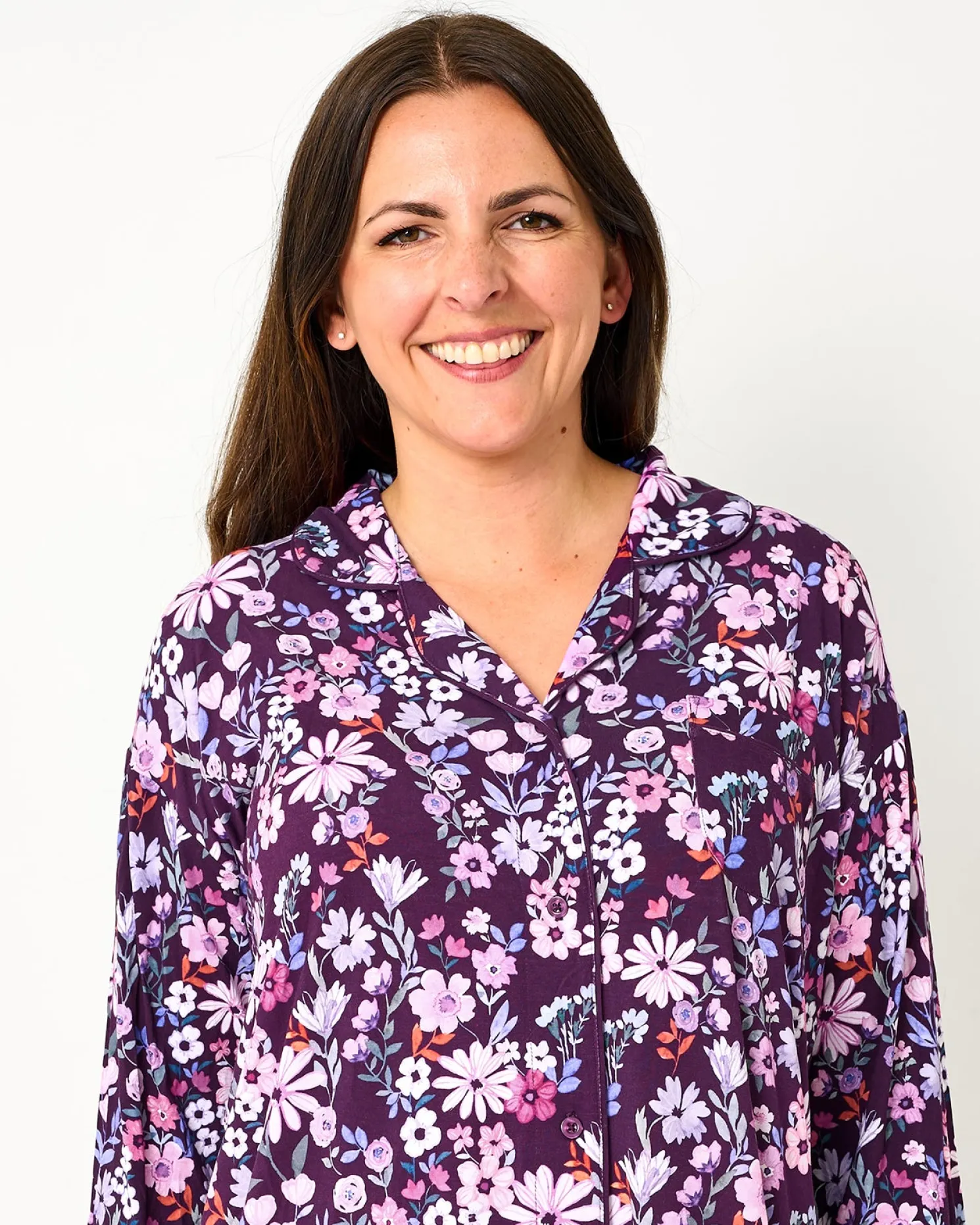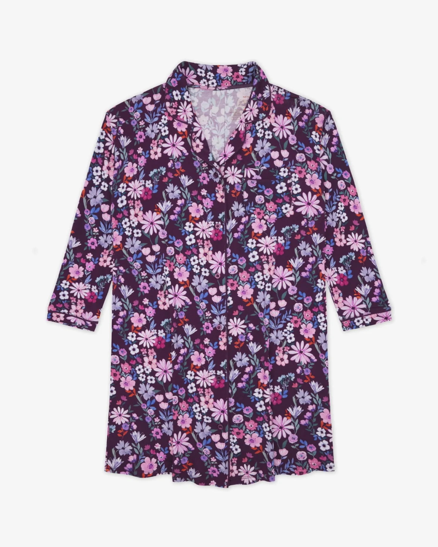 Harvest season style! The Violet Meadow Women’s Sleep Shirt features enchanting wildflowers in rich fall hues on buttery soft Lunaluxe® Bamboo. This women’s bamboo sleep shirt has a button-down front for easy nursing and hits above the knee. Perfect for mommy & me matching on crisp autumn nights!